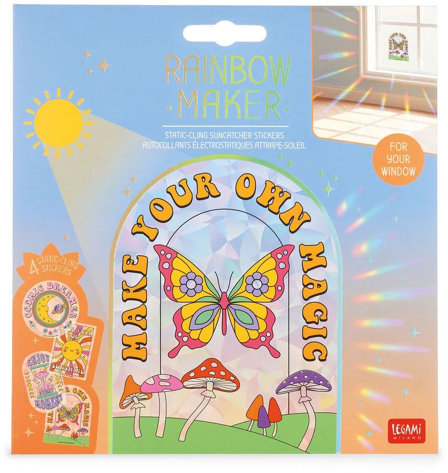 Keď vám život dopraje slnečný svit… môžete si vytvoriť dúhu! Sledujte, ako sa kúzla dejú mihnutím oka, so súpravou 4 samolepiek Suncatcher na okná od Legami, ktoré sa prilepia statickou elektrinou – Rainbow Maker. Stačí ich nalepiť na okno a počkať, kým nimi presvitajú slnečné lúče a rozžiaria akýkoľvek domov farbami dúhy.