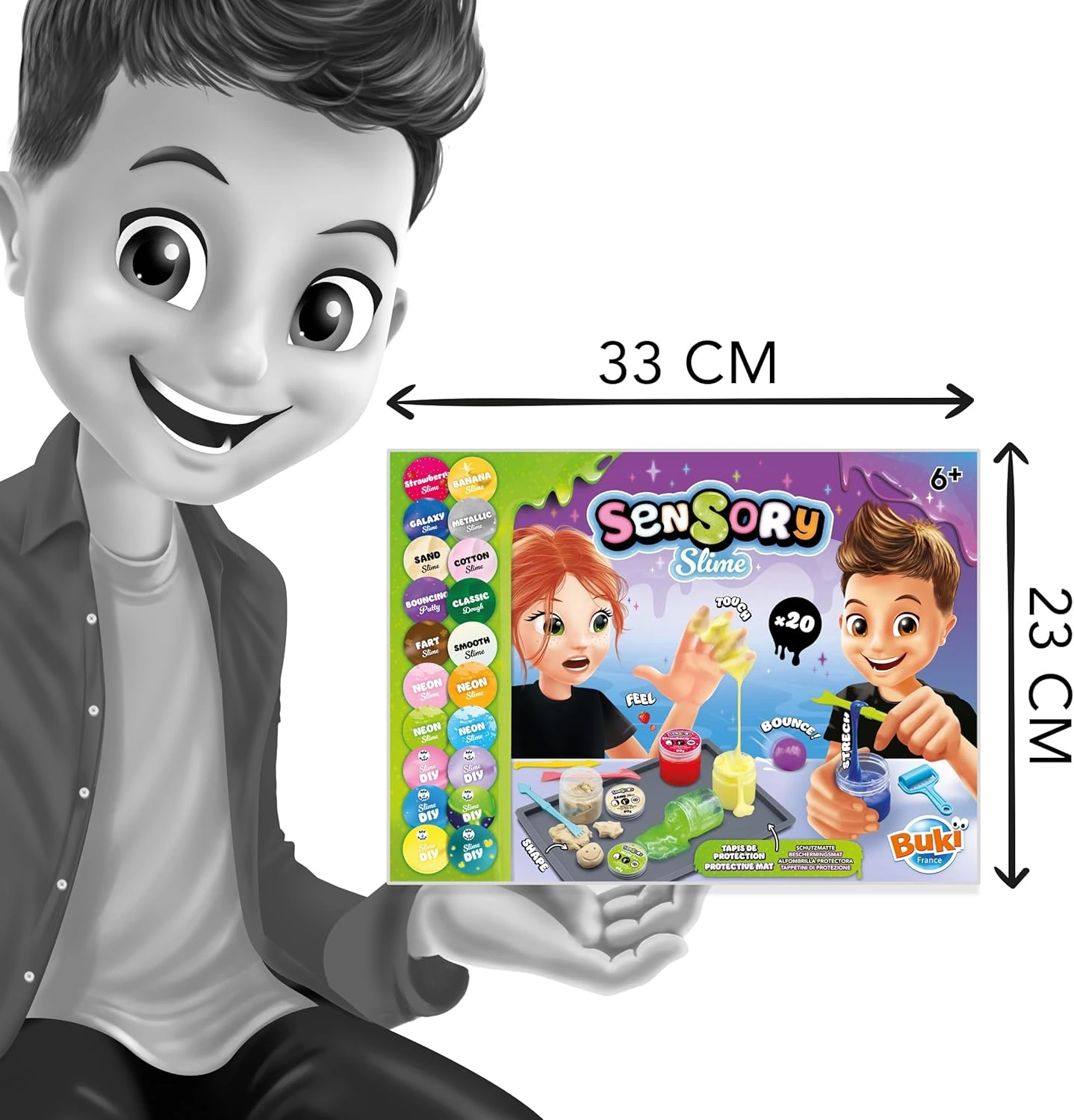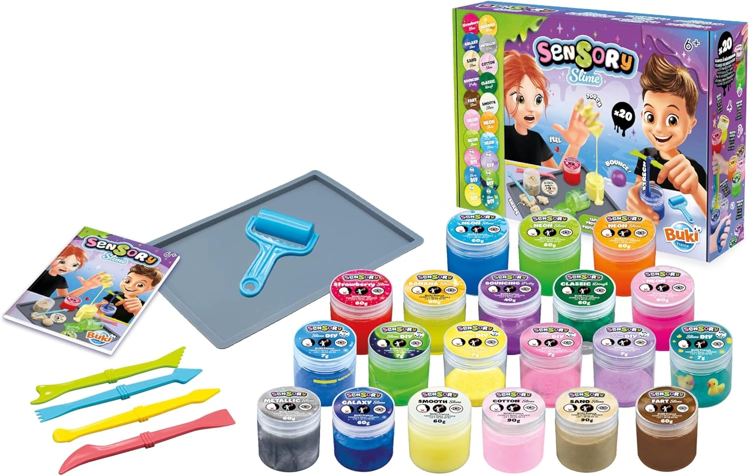 Objavte svet zábavných a jedinečných textúr s BUKI - Sensorický Sliz! Táto súprava umožňuje vytvoriť a objaviť až 20 rôznych druhov slizov – od skákacieho a svietiaceho slizu až po neónový, bavlnený, metalický či galaktický. Ide o relaxačnú a zmyslovú hračku, ktorá je ideálna pre deti od 6 rokov.