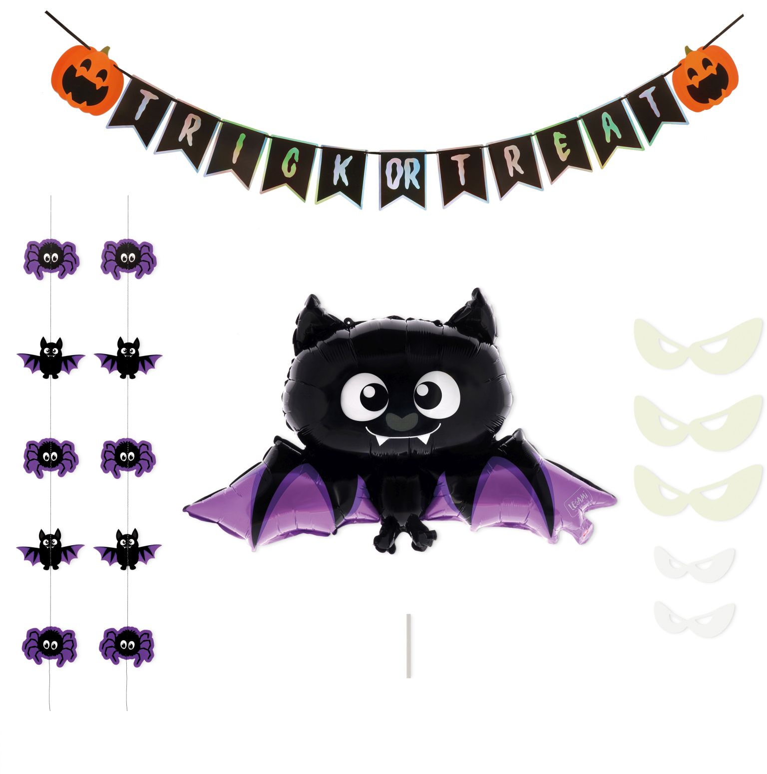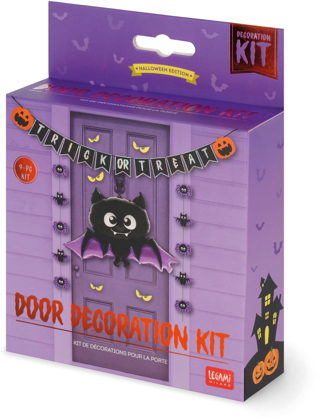 Sada dekorácií na dvere Legami v halloweenskom dizajne s fóliovými detailmi. Obsahuje girlandu, závesné šnúry s dekoráciami, samolepky svietiace v tme a nafukovací balón, ktorý je kompatibilný s héliom.