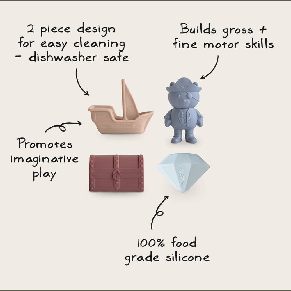 Urobte z kúpania veľké dobrodružstvo so sadou kúpeľových hračiek Mushie Pirate Mold Free, ktorá obsahuje roztomilého pirátskeho medvedíka, truhlicu s pokladom, loď a drahokam.