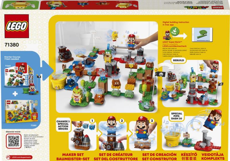 Urob hry s LEGO® Super Mariom ešte úžasnejšími a vytváraj jedinečné levely vďaka setu pre tvorcov! Vyber pre LEGO® Maria (figúrka nie je súčasťou balenia) odmenu pomocou nastaviteľnej časovej kocky a kocky s doplnkami. Vybuduj nové výzvy a zaveď do hry aj Larryho, Goombu, Bob-omba a Koopu Paratroopu. Pridaj aj špeciálny dielik rúry „Zabehni za 30“, level dokonči do 30 sekúnd a získaj ešte viac mincí!