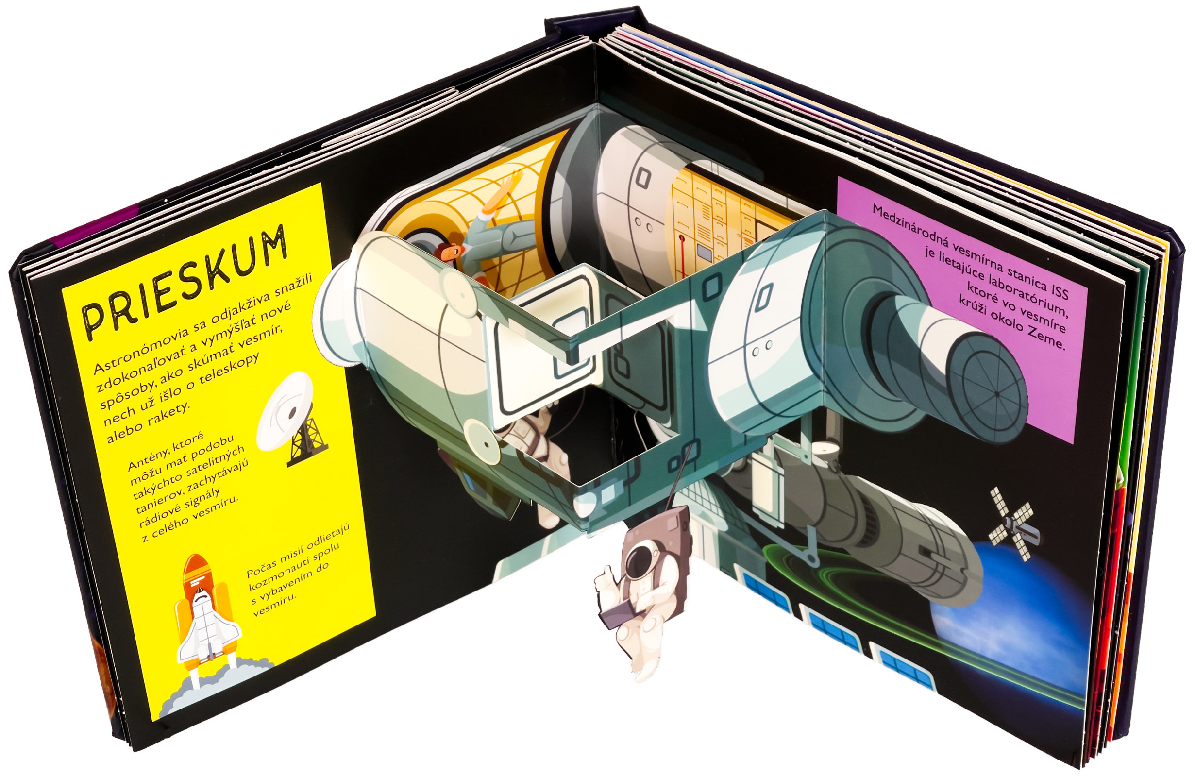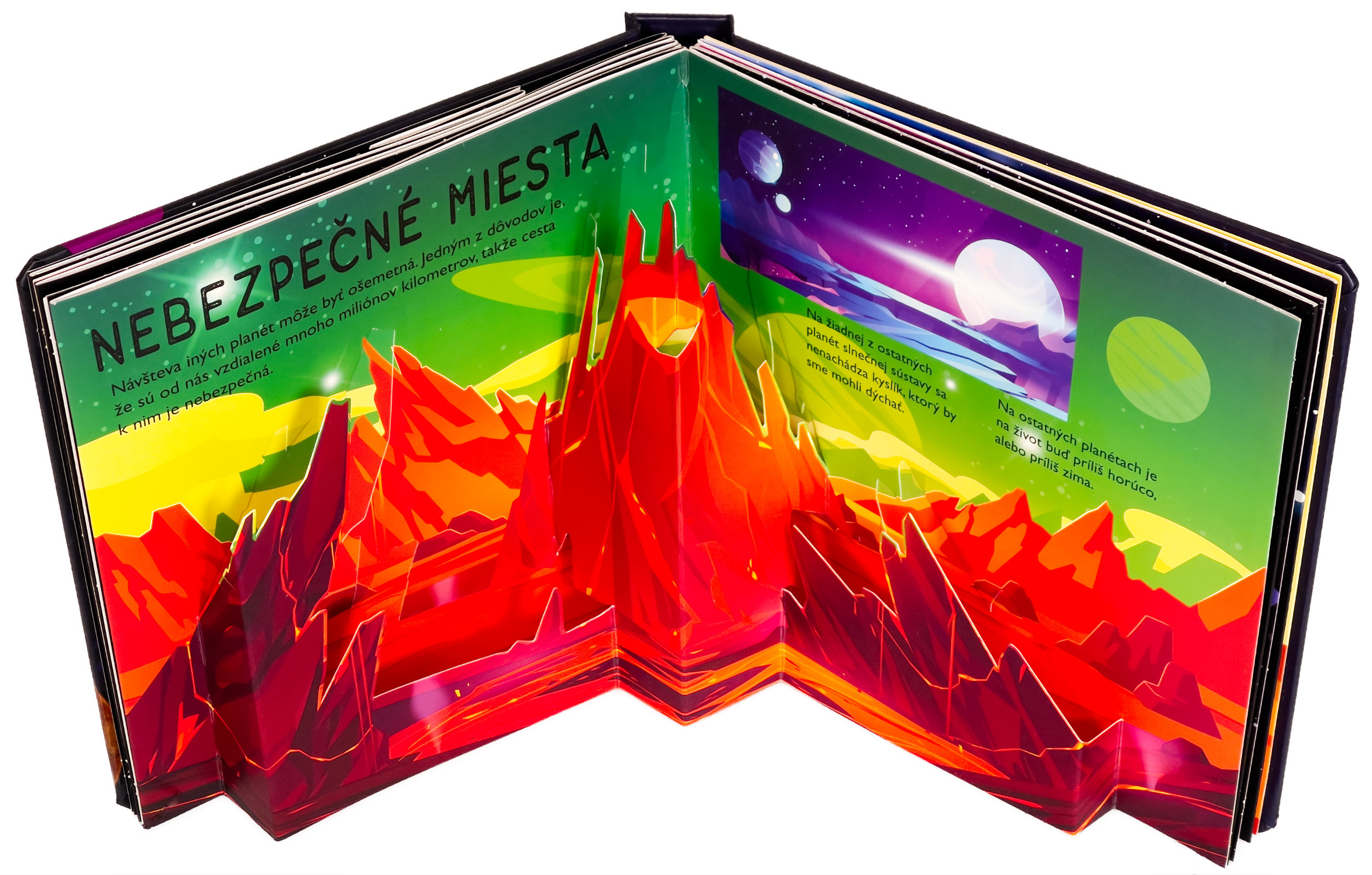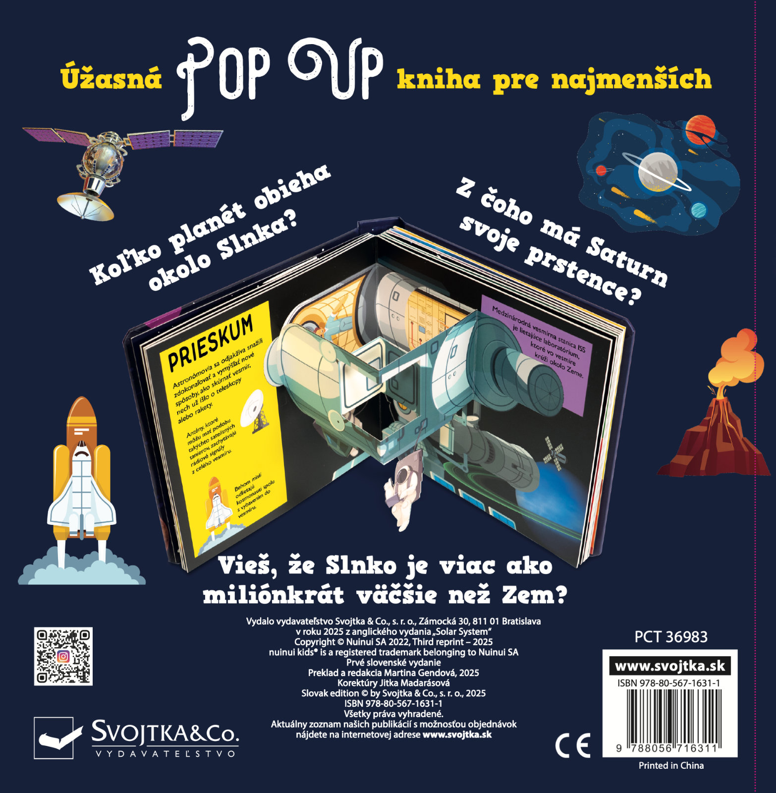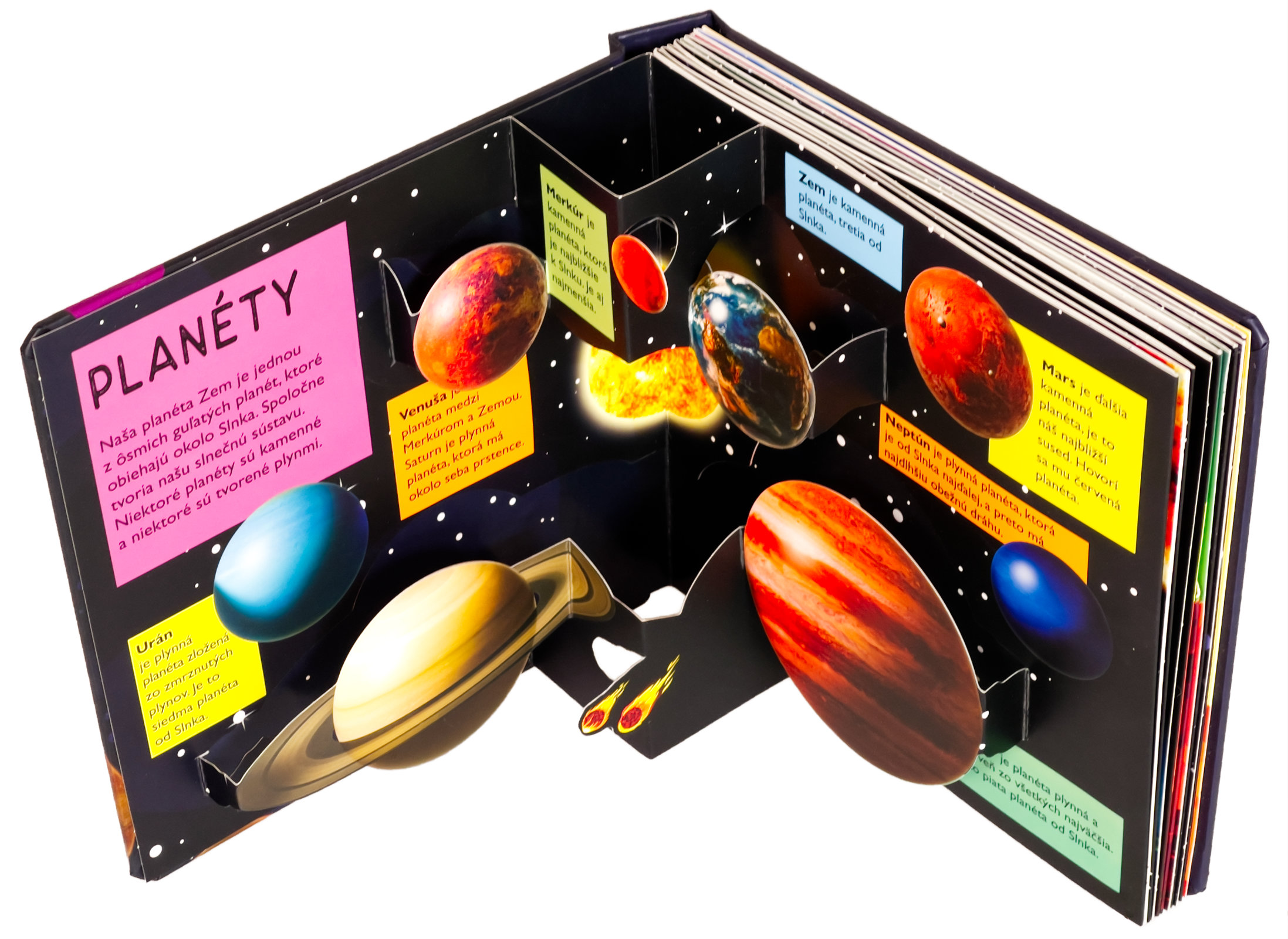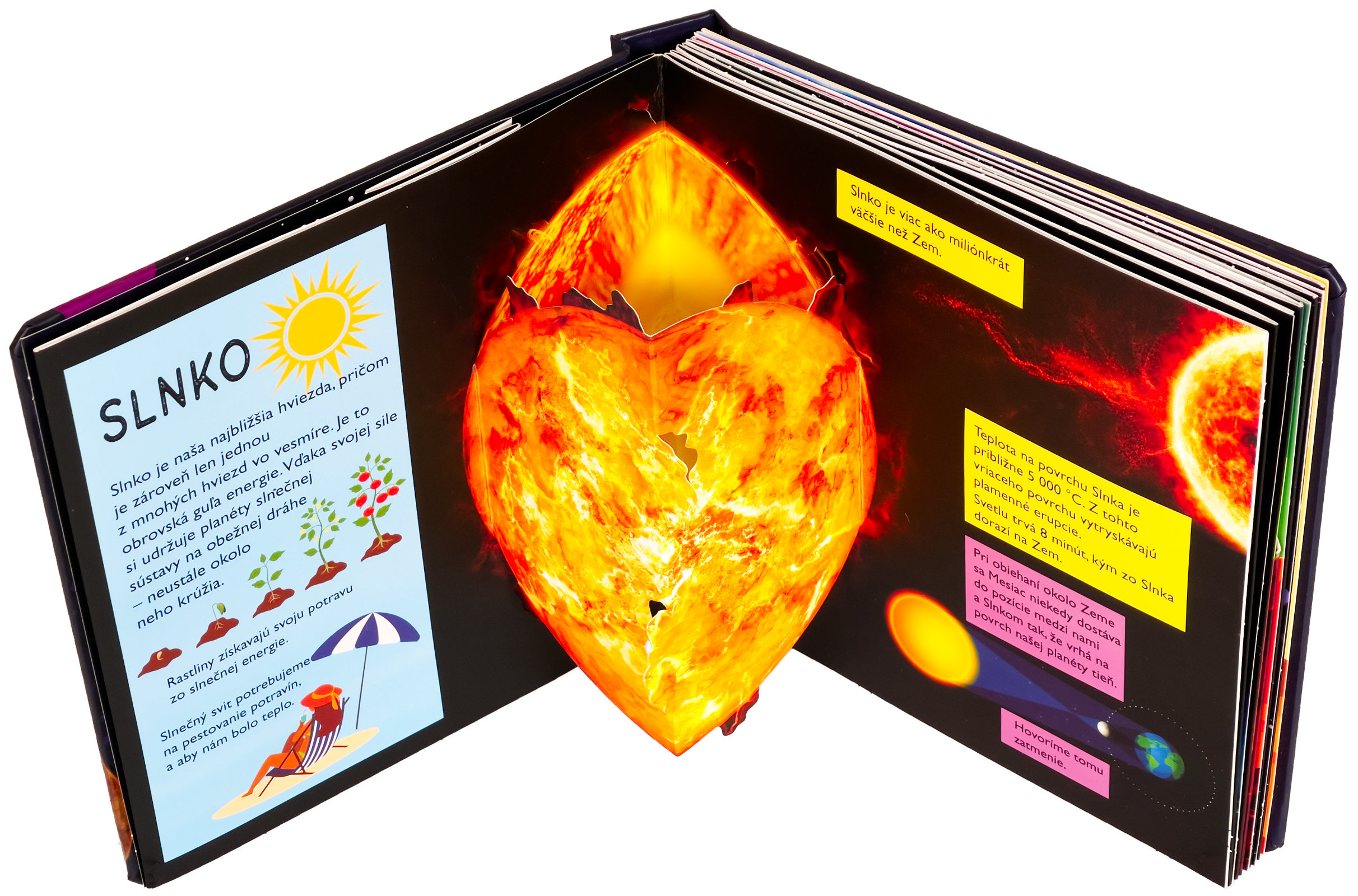 Koľko planét obieha okolo Slnka? Z čoho má Saturn svoje prstence? Vieš, že Slnko je viac ako miliónkrát väčšie než Zem? Vstúp do tejto krásne ilustrovanej knihy s množstvom priestorových pop-up obrázkov a nájdeš odpovede na tieto otázky a dozvieš sa aj mnoho ďalšieho! Kniha je určená pre najmenšie deti, ktoré sa vďaka nej zoznámia s našou Slnečnou sústavou, planétami, Slnkom, Mesiacom, preskúmajú aj vesmír a spoznajú zázračnú planétu Zem. Pre malé deti sú pop-up obrázky ideálne, pretože do nich môžu doslova vstúpiť a všetko si lepšie a názorne predstaviť. Toto interaktívne a hravé spracovanie vo vašich deťoch iste vzbudí záujem a udrží pozornosť na dlhé hodiny.Počet strán: 20