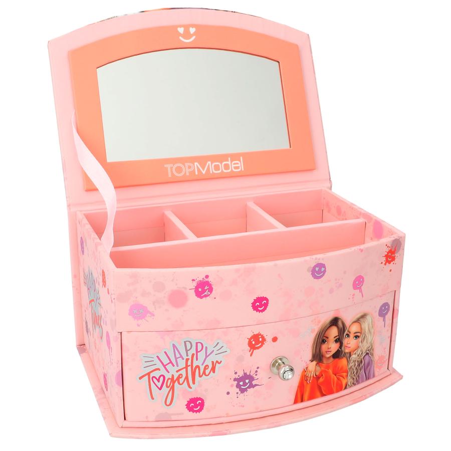 Kvalitne spracovaná dievčenská šperkovnica značky Top Model vyrobená z pevného kartónu so zrkadielkom. Šperkovnica ponúka dostatočný vnútorný priestor pre prehľadné uloženie všetkých šperkov! Horné poschodie je rozdelené niekoľkými priehradkamipre uloženie menších šperkov a prstienkov. Spodné dve vnútorné priehradky sú ideálne na väčšie šperky. Obľúbený dizajn nadchne všetky dievčatká! Rozmery: 15,5 x 10,8 x 8,5 cm.