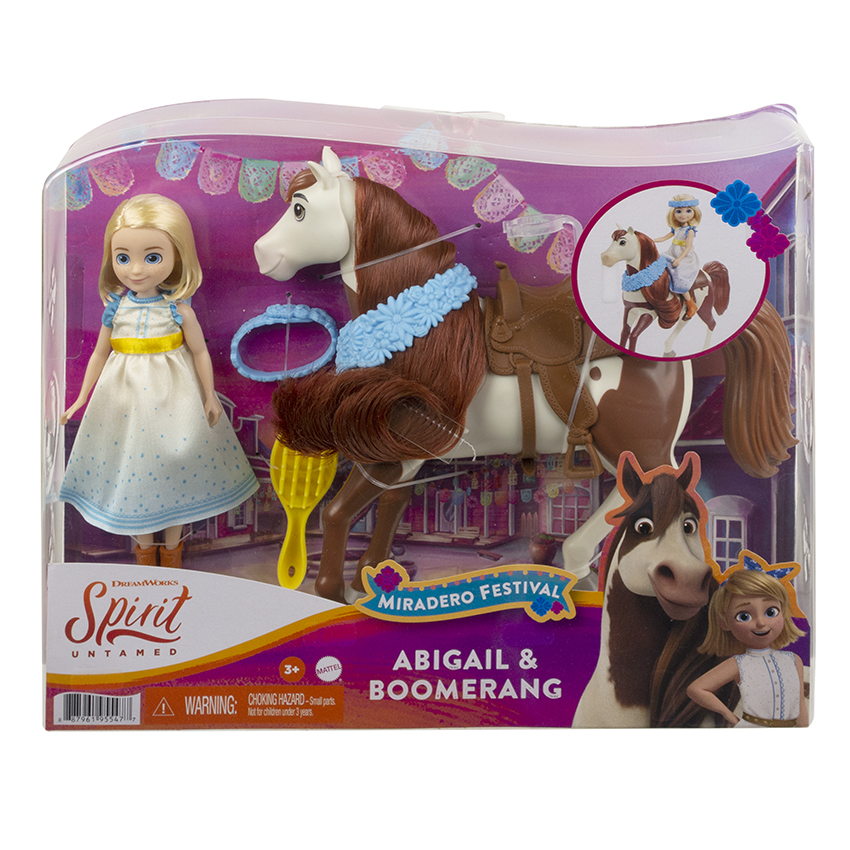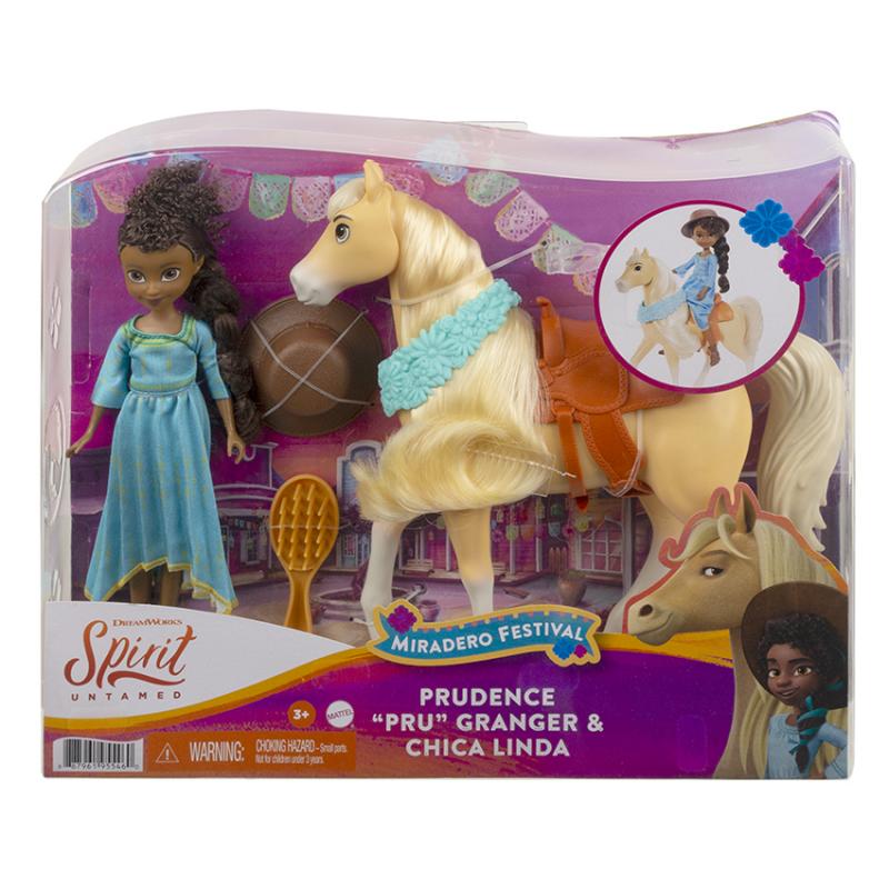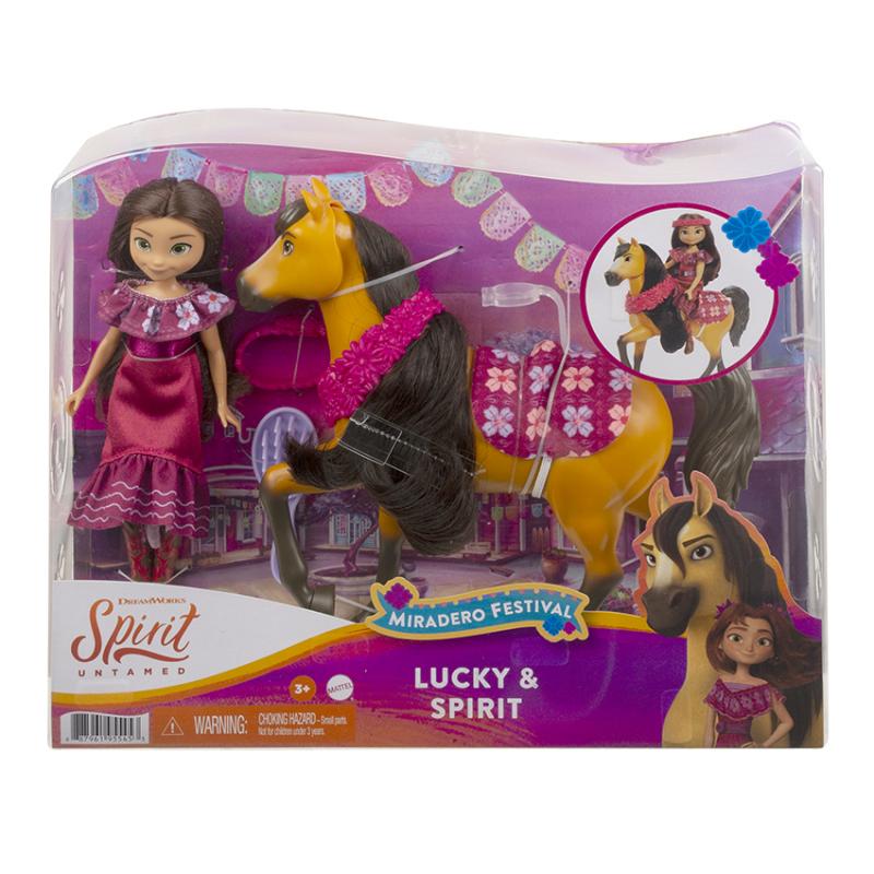 Buďte súčasťou všetkého toho priateľstva, statočnosti a dobrodružstva s animovaným filmom Spirit od DreamWorks! V sortimente bábiky a kone Spirit Festival Doll & Horse je na výber medzi bábikami Šťastíčko, Abigail alebo Pru, každé oblečené v roztomilých festivalových šatách s kvetinovými doplnkami, a ich koní, čo majú hrivy s trblietavými, lesklými vlasmi a festivalovú „konskú deku“. Vyberte si z Festival Šťastíčko a Spirit, Festival Abigail a Boomerang alebo Festival Pru a Chica Linda. Každá sa predáva samostatne, v závislosti od dostupnosti. Farby a dekorácie sa môžu líšiť. Pre deti od 3 rokov.