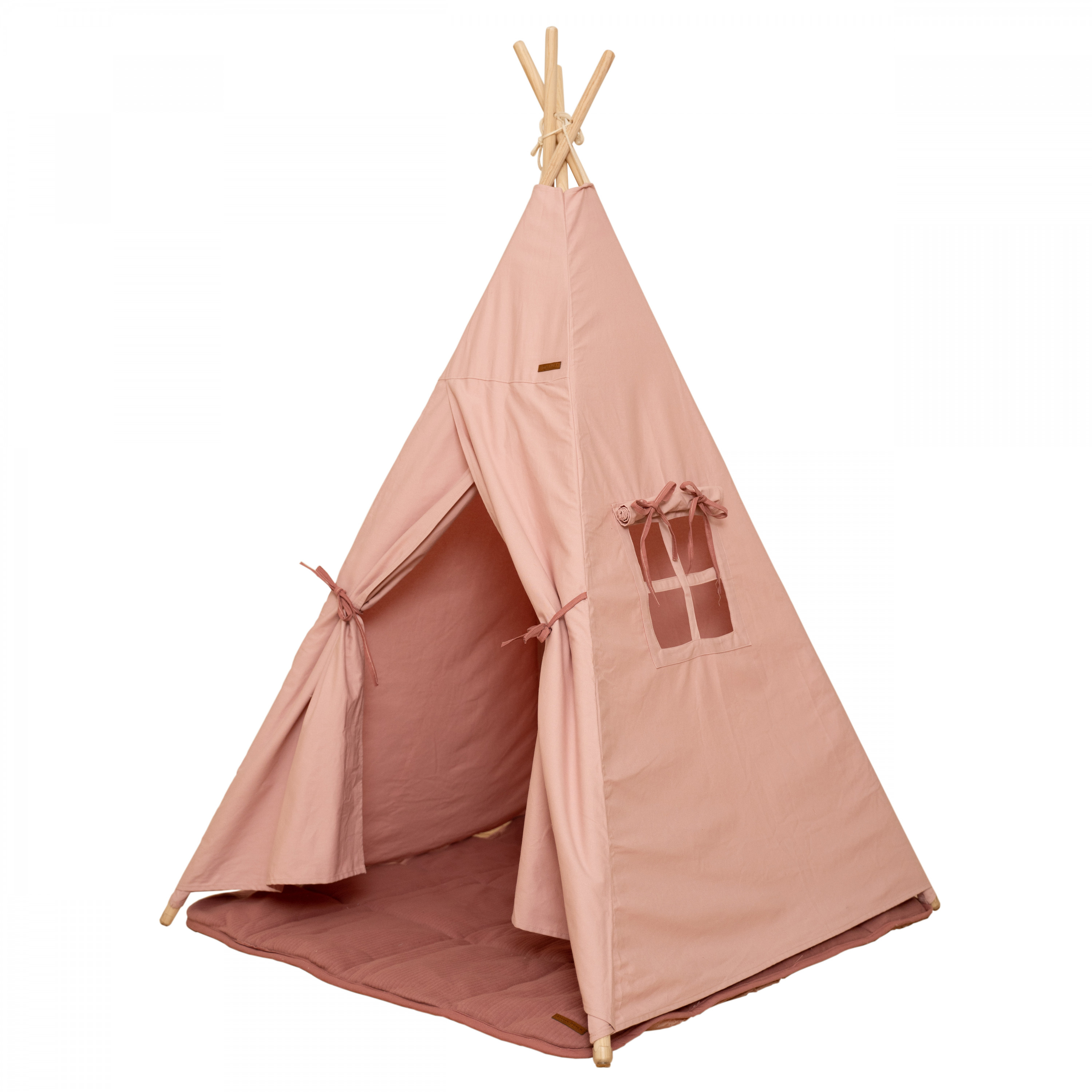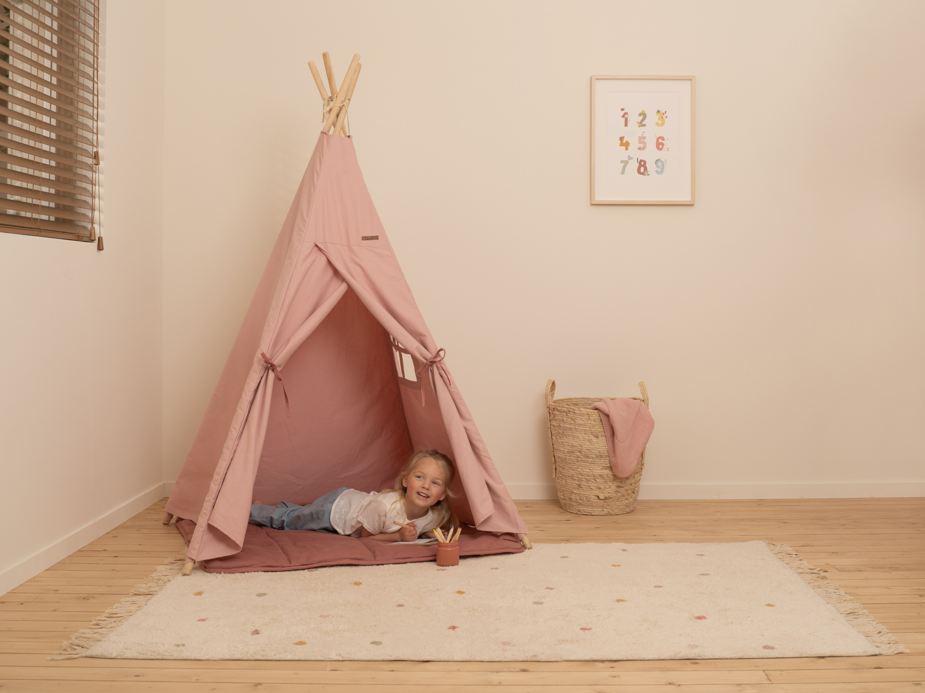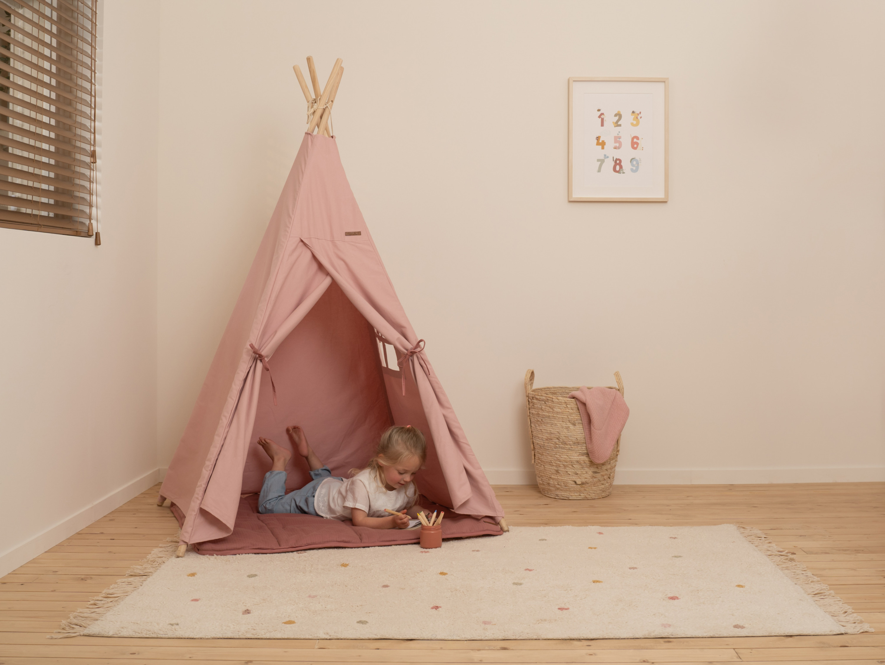 Úžasný luxusný stan je skvelým miestom pre všetky deti, ktoré majú rady schovávačky a svoj kútik len pre seba. Stan z pevného bavlneného plátna s mäkkou podložkou bude vďačným pomocníkom pri hrách a rozvíjaní fantázie vašich detí. Stan je vybavený drevenými stanovými tyčami, mäkkou podložkou s protišmykovou spodnou stranou, okienkom a vchodovým závesom.