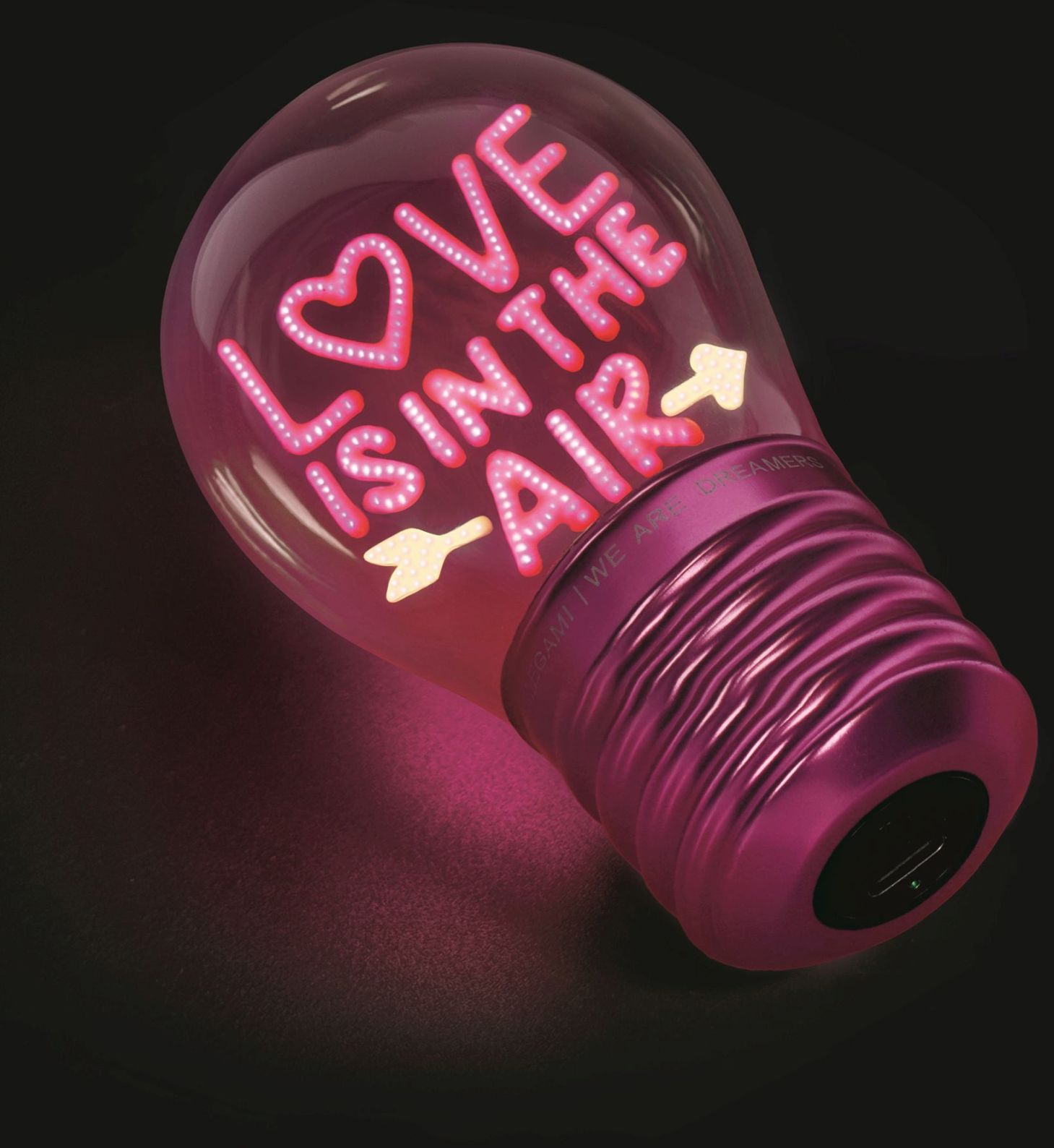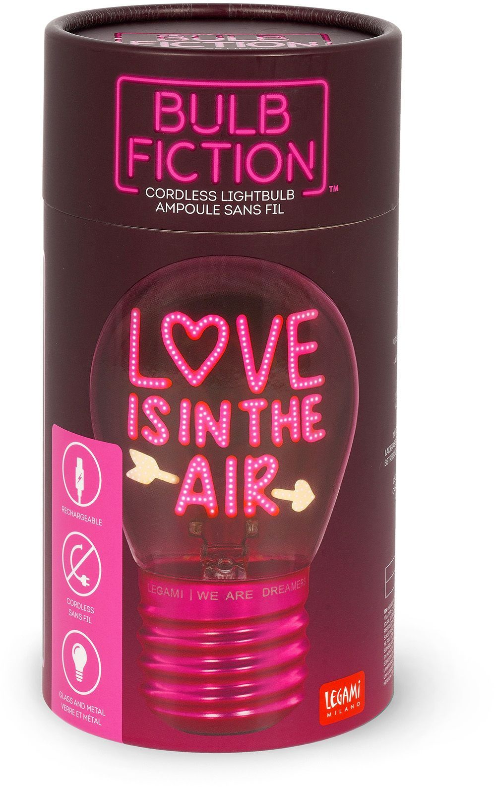 Legami Bulb Fiction – Love Is In The Air je dekoratívna stolná lampa v tvare žiarovky, ktorá dodá pracovni, spálni aj detskej izbe jemné svetlo a romantickú atmosféru.