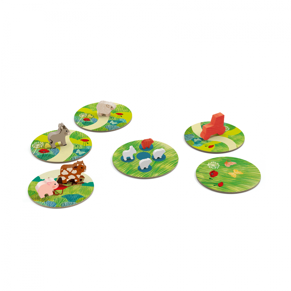 Kooperatívna hmatová hra. Úlohou hráčov je doviesť aspoň zvieratko z gazdovstva na pasienok, skôr než sa gazda traktorom vráti na gazdovstvo. Hráči posúvajú zvieratká na základe nahmatania príslušného zvieratka vo vrecúšku. Pozor, nestačí len nahmatať správne zvieratko: ak je zvieratko z vrecúška červené a nie biele, ide o políčko vpred gazda v traktore. Kto bude prvý: aspoň 1 zvieratko na pasienku alebo gazda na gazdovstve? Obsah: 8 herných doštičiek (štartovacia (gazdovstvo), cieľová (pasienok), 5 cestičiek 1 doštička s mlákami), 4 veľké figúrky zvierat (krava, ovca, somár, prasa), traktor, 12 malých figúrok zvierat (4 zvieratá x 2 biele + 1 čierna), vrecúško. Odporúčaný vek: 4 – 8 rokov Počet hráčov: 1 – 4 Trvanie hry: 10 min. Rozmery balenia: 21,5 x 21,5 x 4 cm