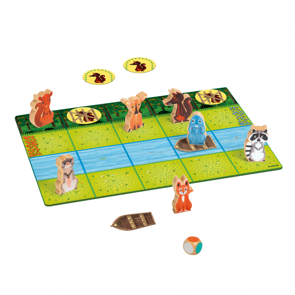 Koopertívna hra s jednoduchými pravidlami. Úlohou hráčov je dostať zvieratká k lesu na opačnom brehu rieky Potomac. Cesta vedie člnom cez rieku s vodopádom a cez čistinu, na ktorej striehne vlk. Keď sa zvieratká dostanú k lesu, hráči zvíťazili! Ťahy sa vykonávajú na základe hodu kockou. Obsah: herný plán, 2 člny, 4 bonusové žetóny, 7 zvieratiek, kocka. Odporúčaný vek: 5 – 10 rokov Počet hráčov: 2 – 4 Trvanie hry: 15 min. Rozmery balenia: 30 x 28 x 4 cm