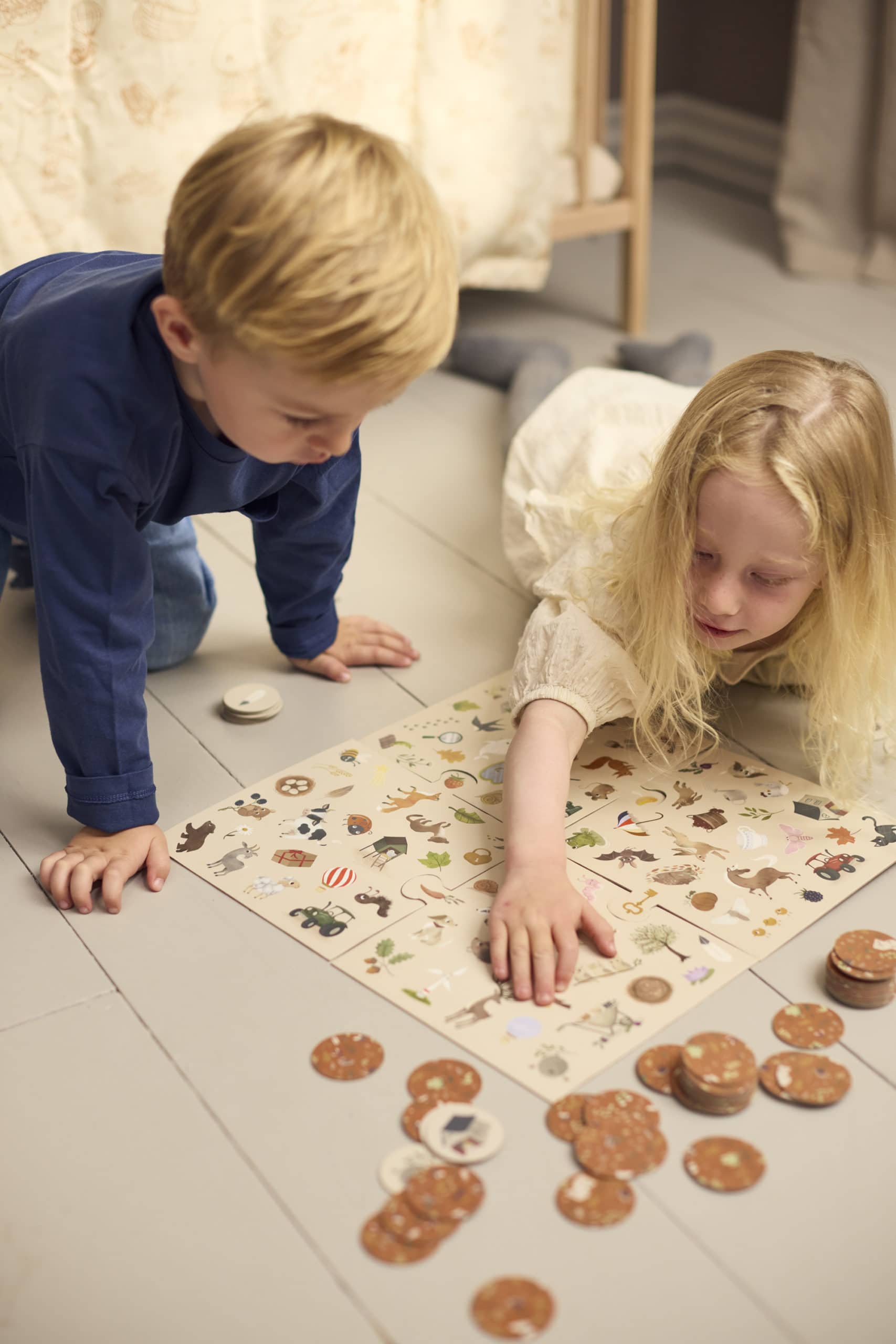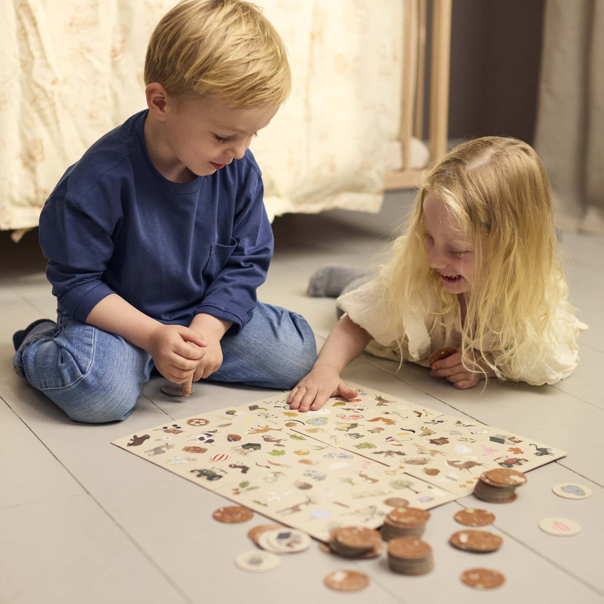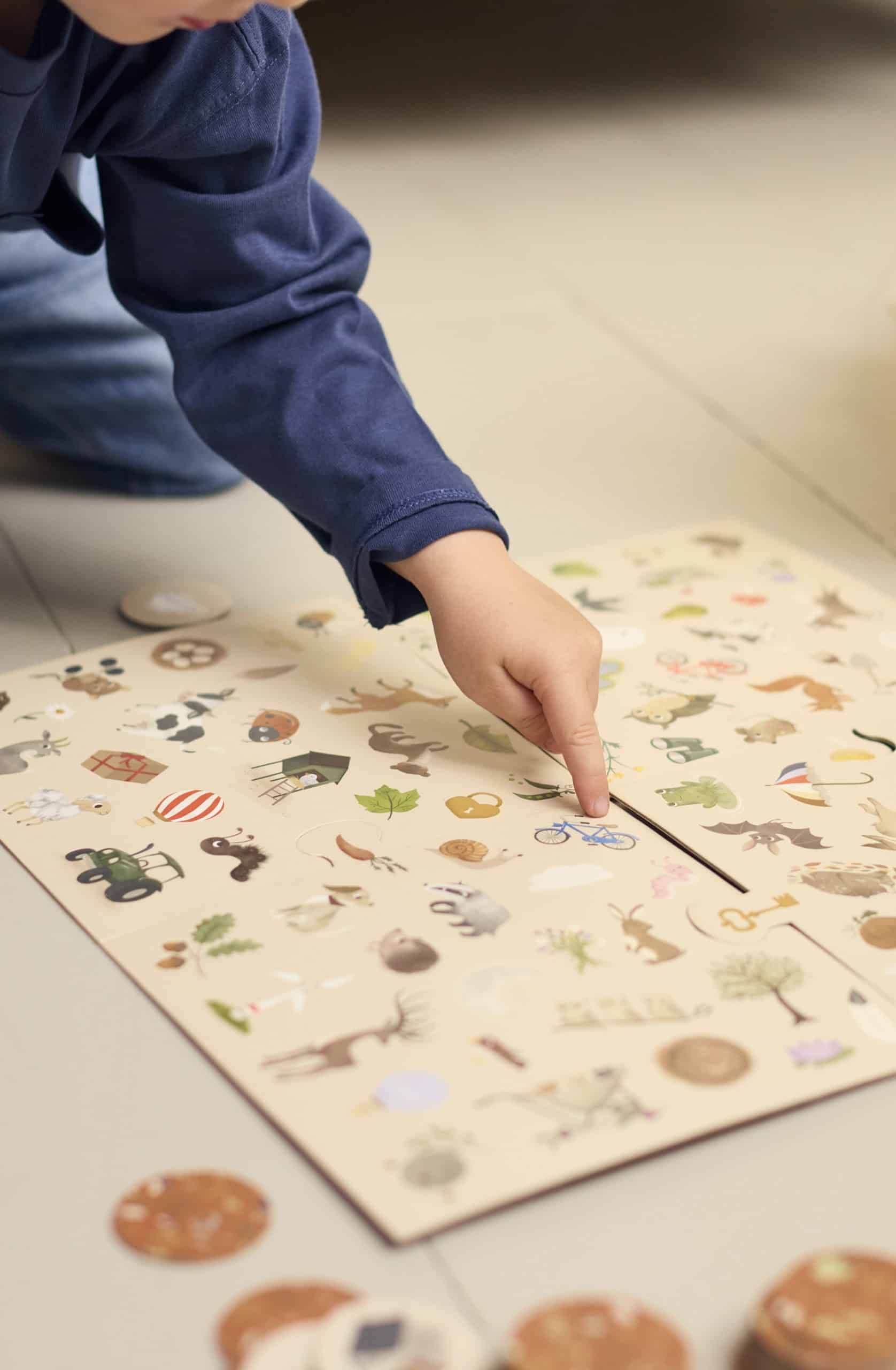 Vyzvite malých aj celú rodinu na zábavnú hru plnú pozorovania s Find It First od FILIBABBA! Táto pútavá hra kombinuje rýchle myslenie a bystré oči, keď hráči súťažia, kto ako prvý nájde zhodné dlaždice na hracom pláne. S 100 krásne ilustrovanými dlaždicami s obľúbenými zvieratkami a prvkami FILIBABBA prináša hra smiech a priateľskú súťaž priamo k stolu.