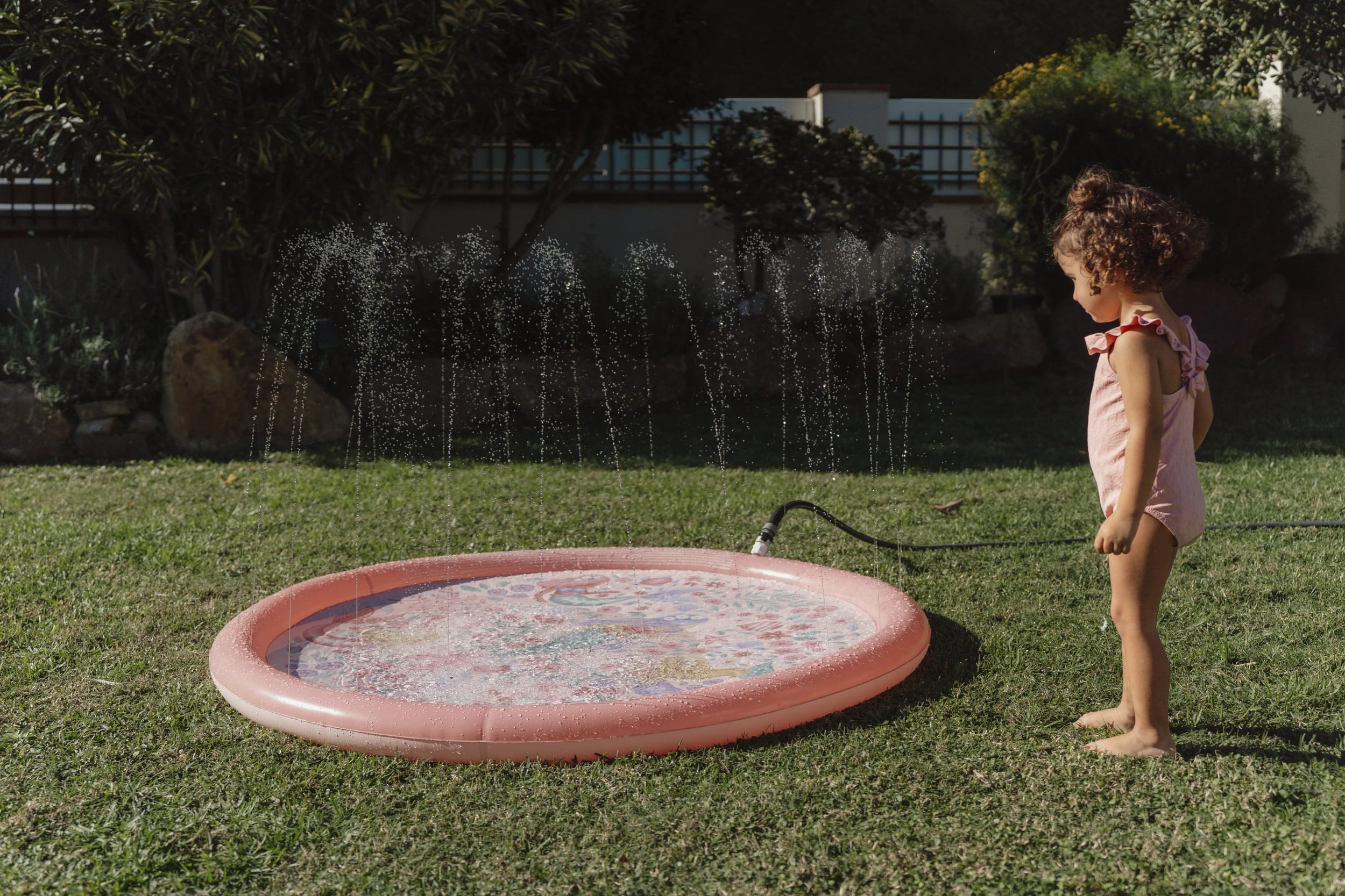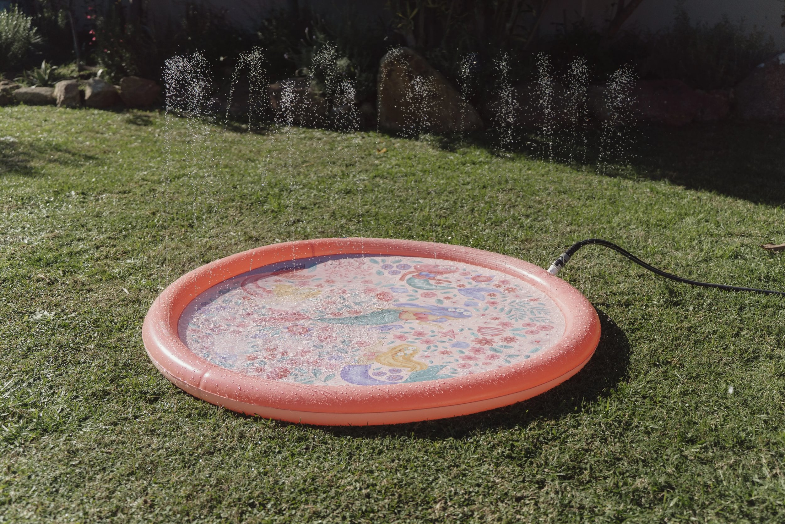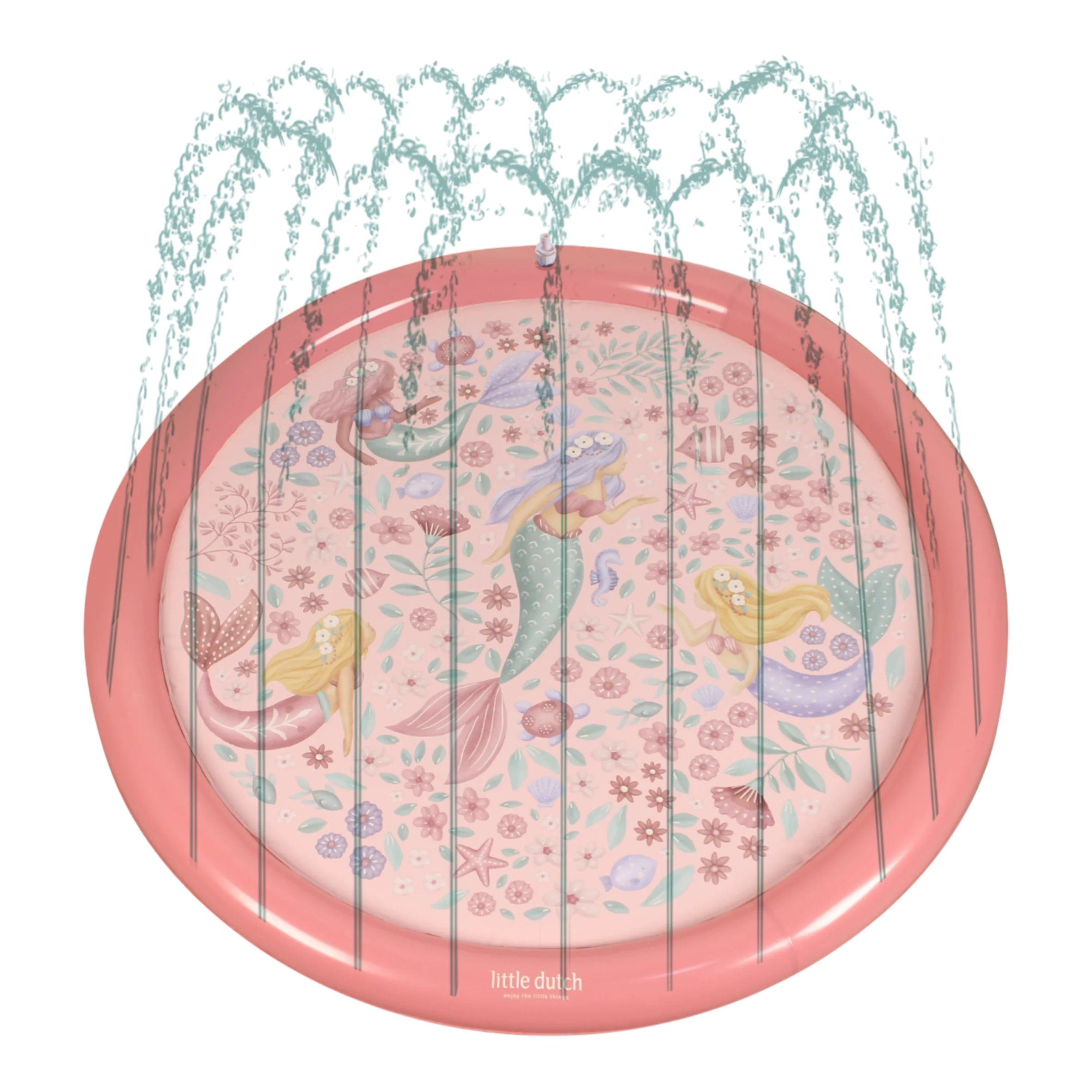 Originálna hracia podložka s vodotryskom, ktorý vytvoríte jednoducho pripojením na záhradnú hadicu s pomocou priloženej spojky. Podložka s krásnou potlačou motívov zo života morskej víly a kvetov je ideálny doplnok na záhradu počas horúcich letných dní. Deti si budú užívať behanie cez striekajúci vodotrysk aj hranie sa s vodou na podložke, ktorá funguje ako plytký bazénik.