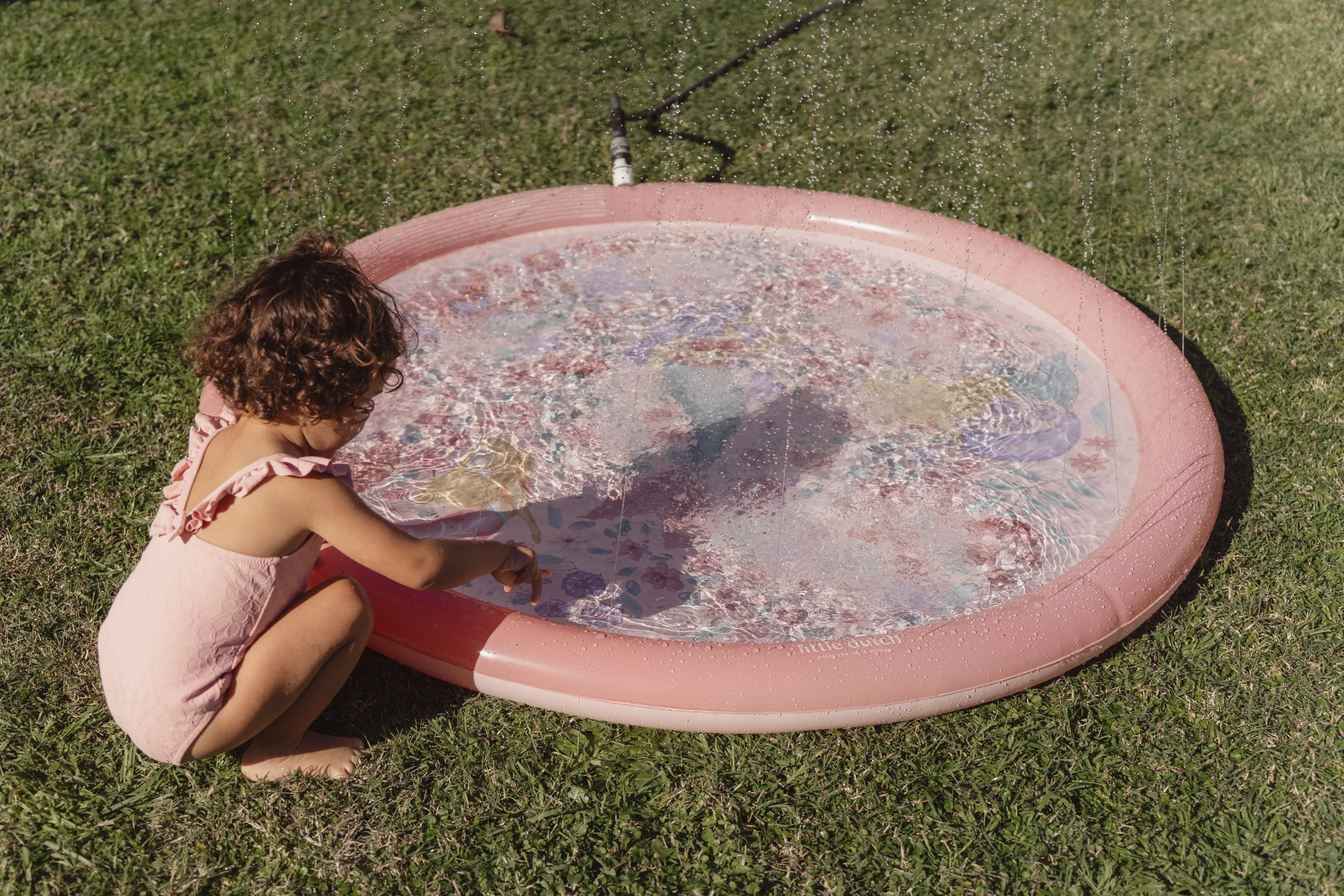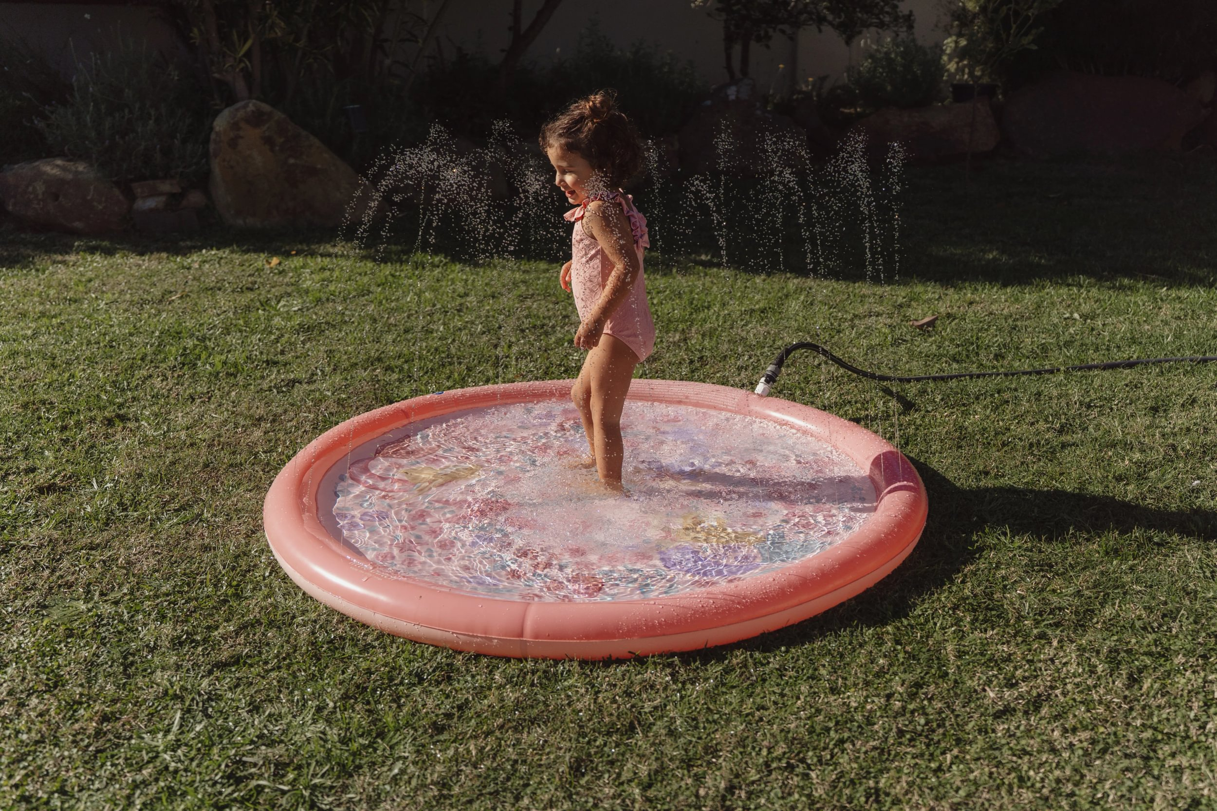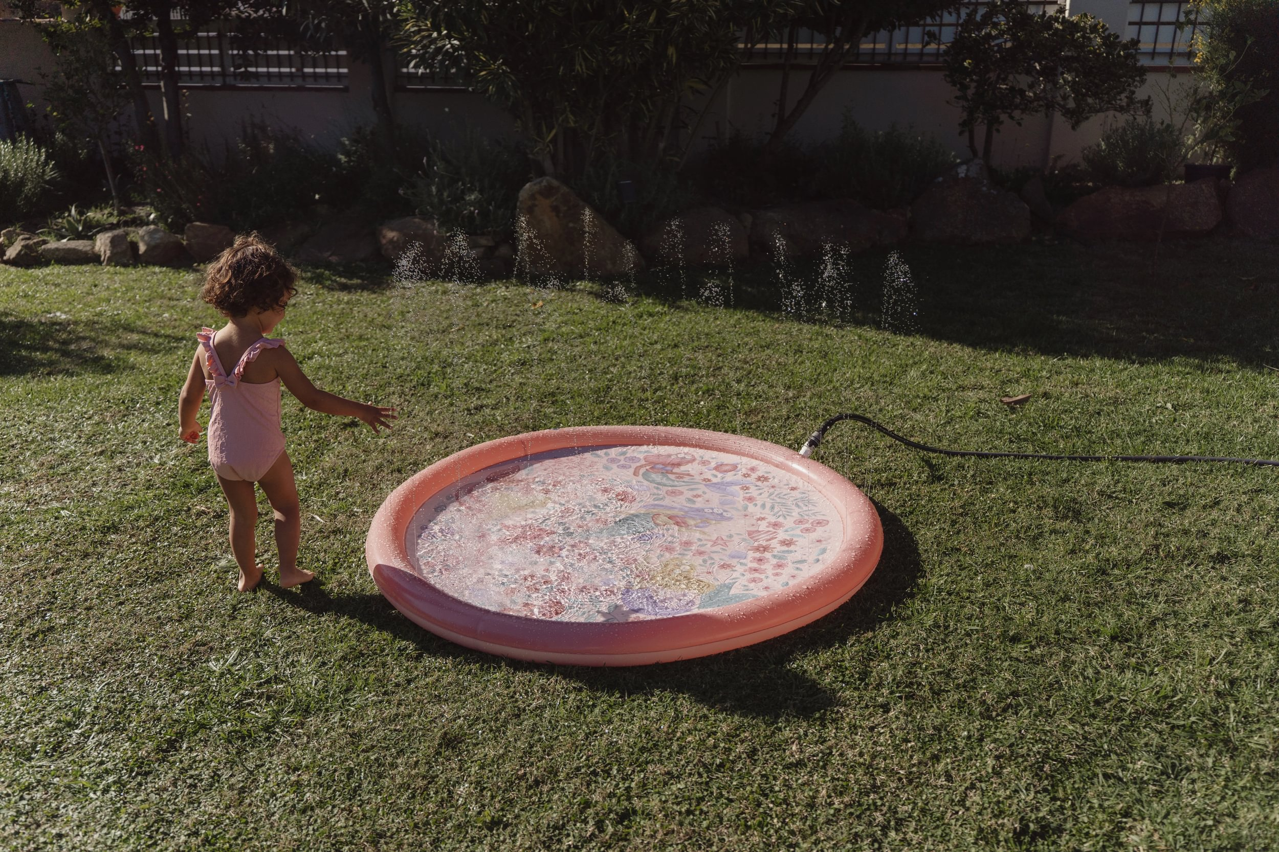 Originálna hracia podložka s vodotryskom, ktorý vytvoríte jednoducho pripojením na záhradnú hadicu s pomocou priloženej spojky. Podložka s krásnou potlačou motívov zo života morskej víly a kvetov je ideálny doplnok na záhradu počas horúcich letných dní. Deti si budú užívať behanie cez striekajúci vodotrysk aj hranie sa s vodou na podložke, ktorá funguje ako plytký bazénik.