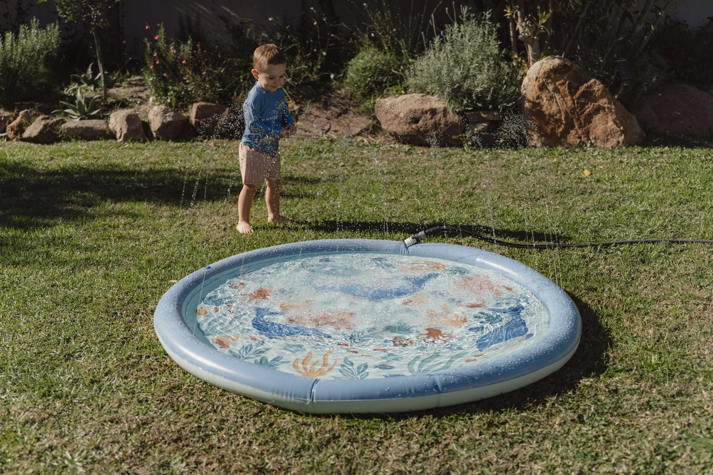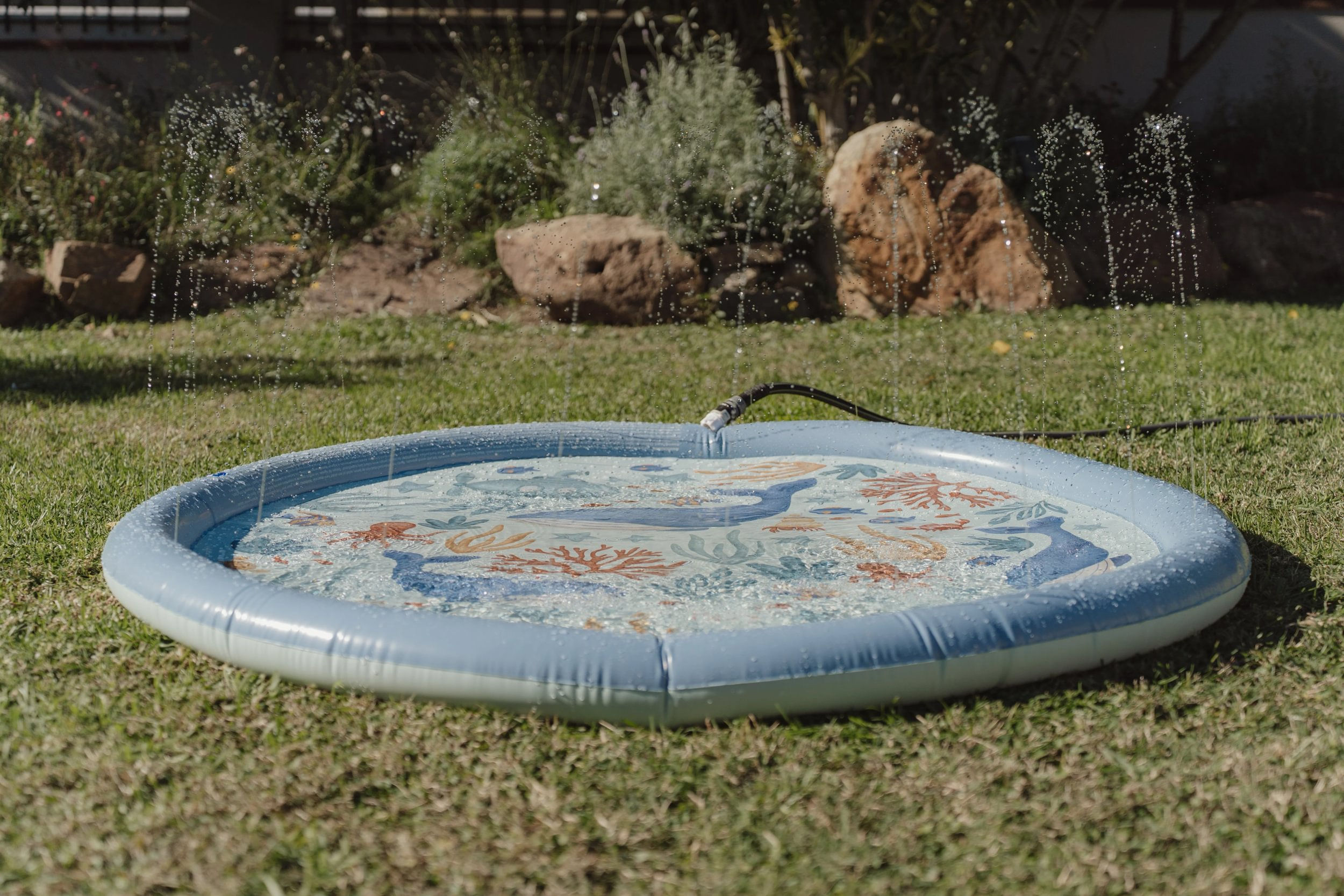 Originálna hracia podložka s vodotryskom, ktorý vytvoríte jednoducho pripojením na záhradnú hadicu s pomocou priloženej spojky. Podložka s krásnou potlačou motívov zo života pod morskou hladinou je ideálny doplnok na záhradu počas horúcich letných dní. Deti si budú užívať behanie cez striekajúci vodotrysk aj hranie sa s vodou na podložke, ktorá funguje ako plytký bazénik.