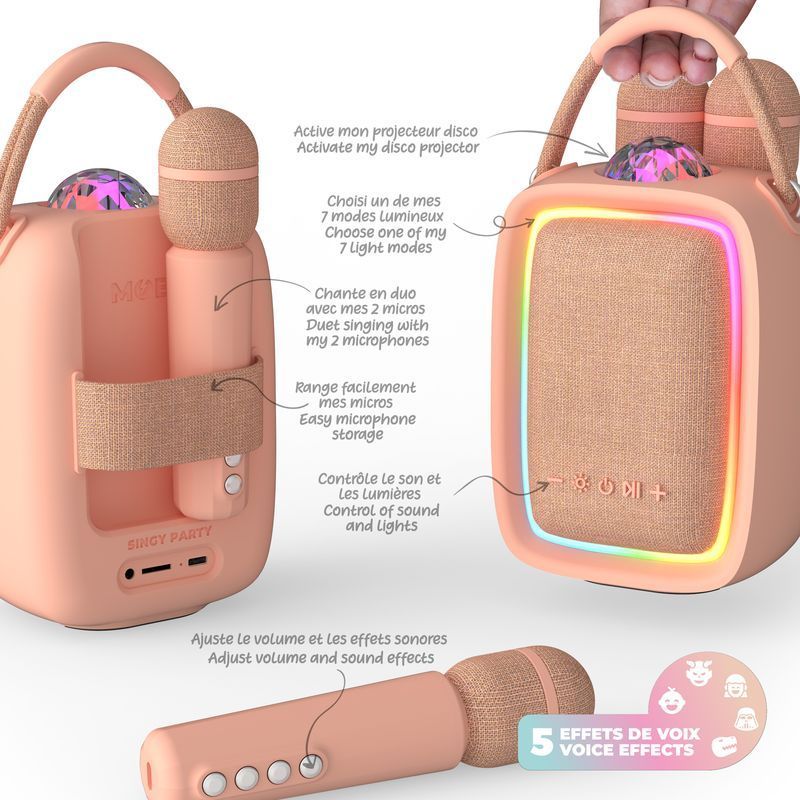 Vďaka dvom mikrofónom môžeš spievať sám alebo si strihnúť duet s priateľmi. Reproduktor premieta viacfarebné svetlá a vytvára tak dynamickú a slávnostnú atmosféru. Hudbu je možné prehrávať hneď tromi spôsobmi – cez Bluetooth, SD kartu alebo AUX vstup. Singy Party je kompatibilný so všetkými zariadeniami a jeho ovládanie je veľmi jednoduché. Má tiež praktické madlo pre jednoduché prenášanie.Hlavné prednosti: