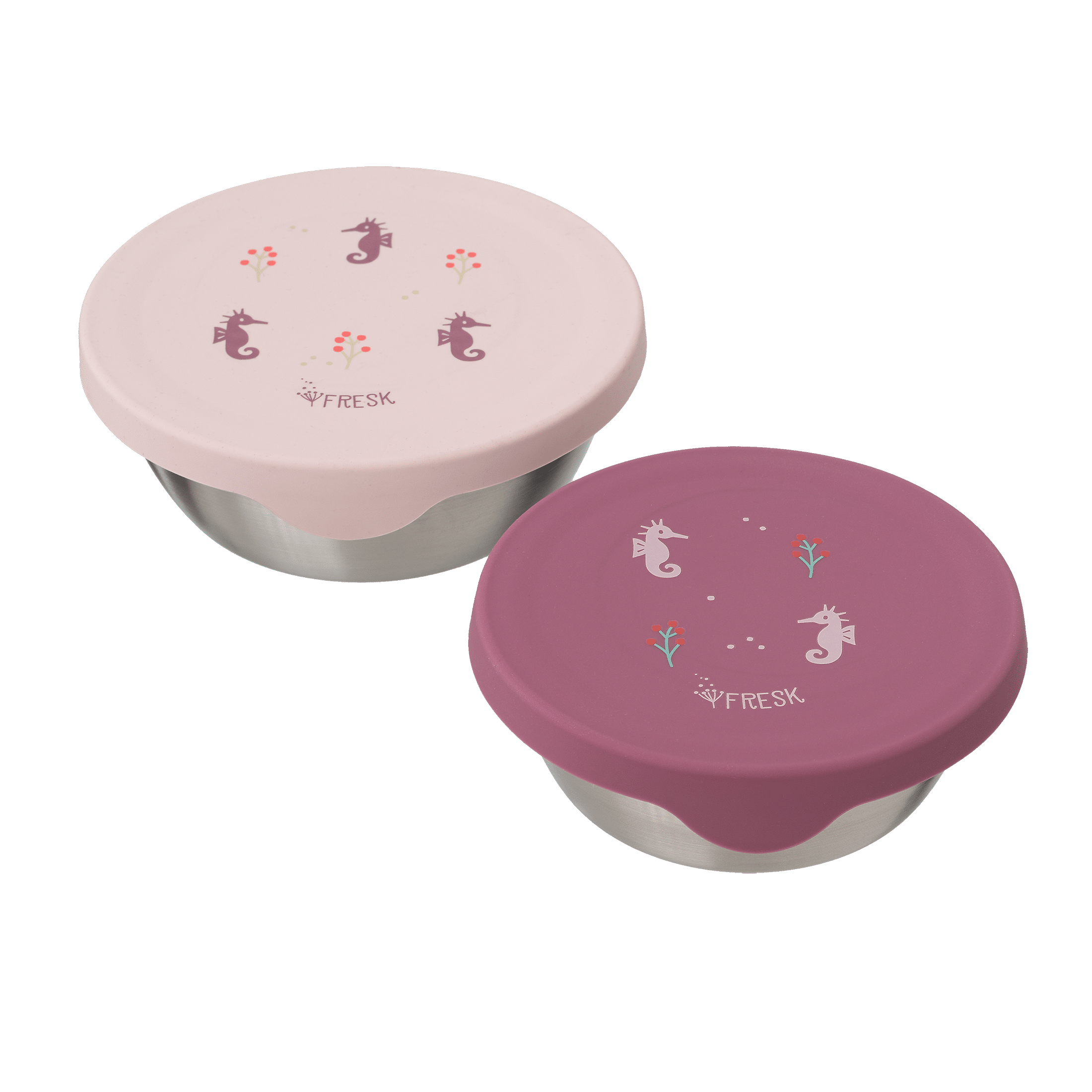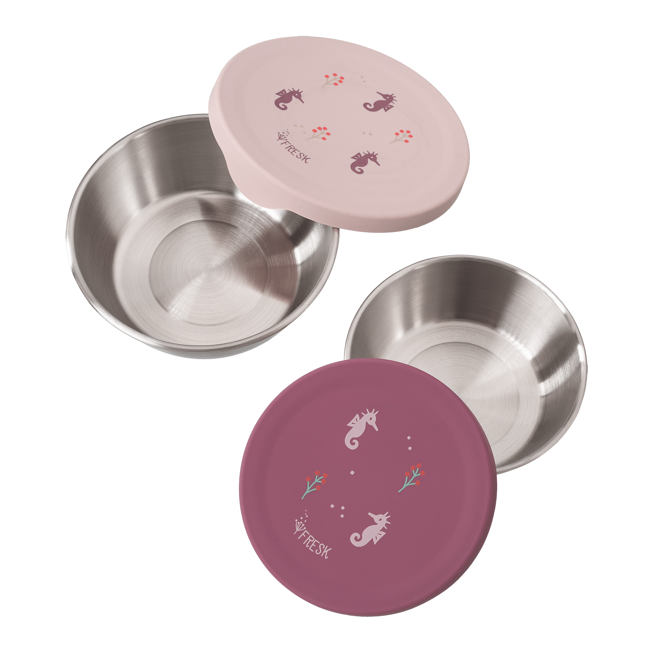 Dve dózy sú vyrobené z pevnej nehrdzavejúcej ocele a majú praktické silikónové viečka. Oceľové dno zabezpečuje, že nenaťahujú farbu ani vôňu z potravín, a flexibilné silikónové viečko ľahko otvoria aj malé detské rúčky.