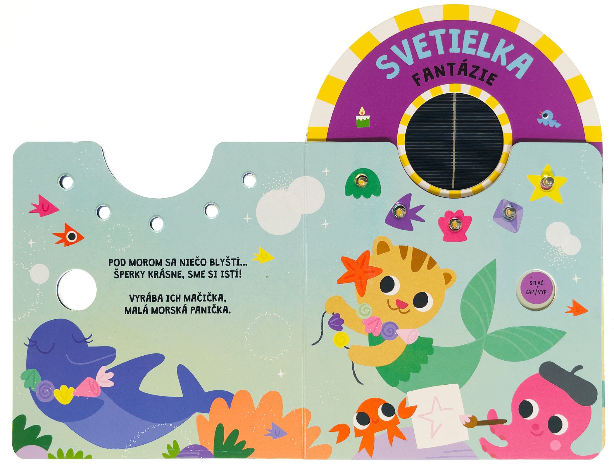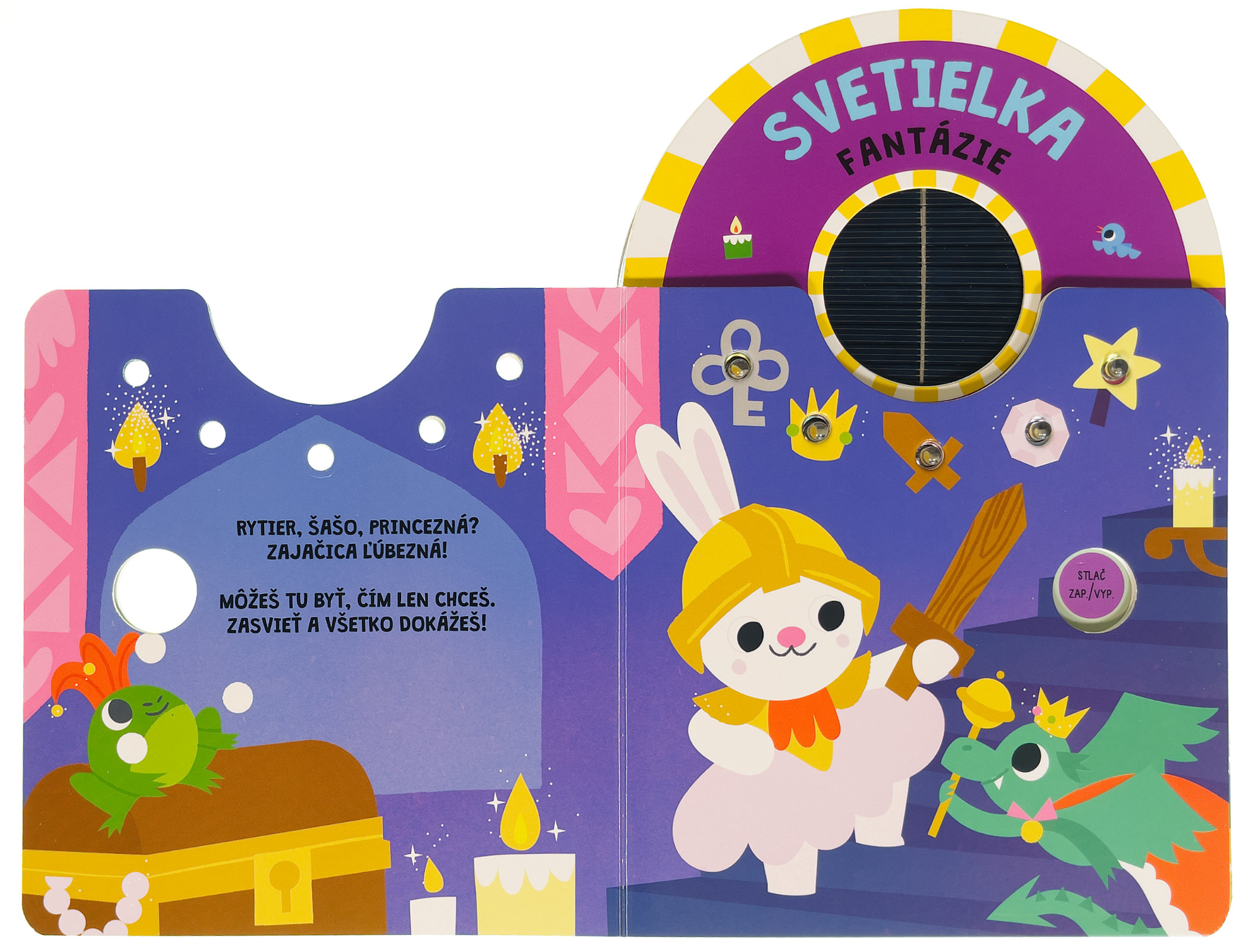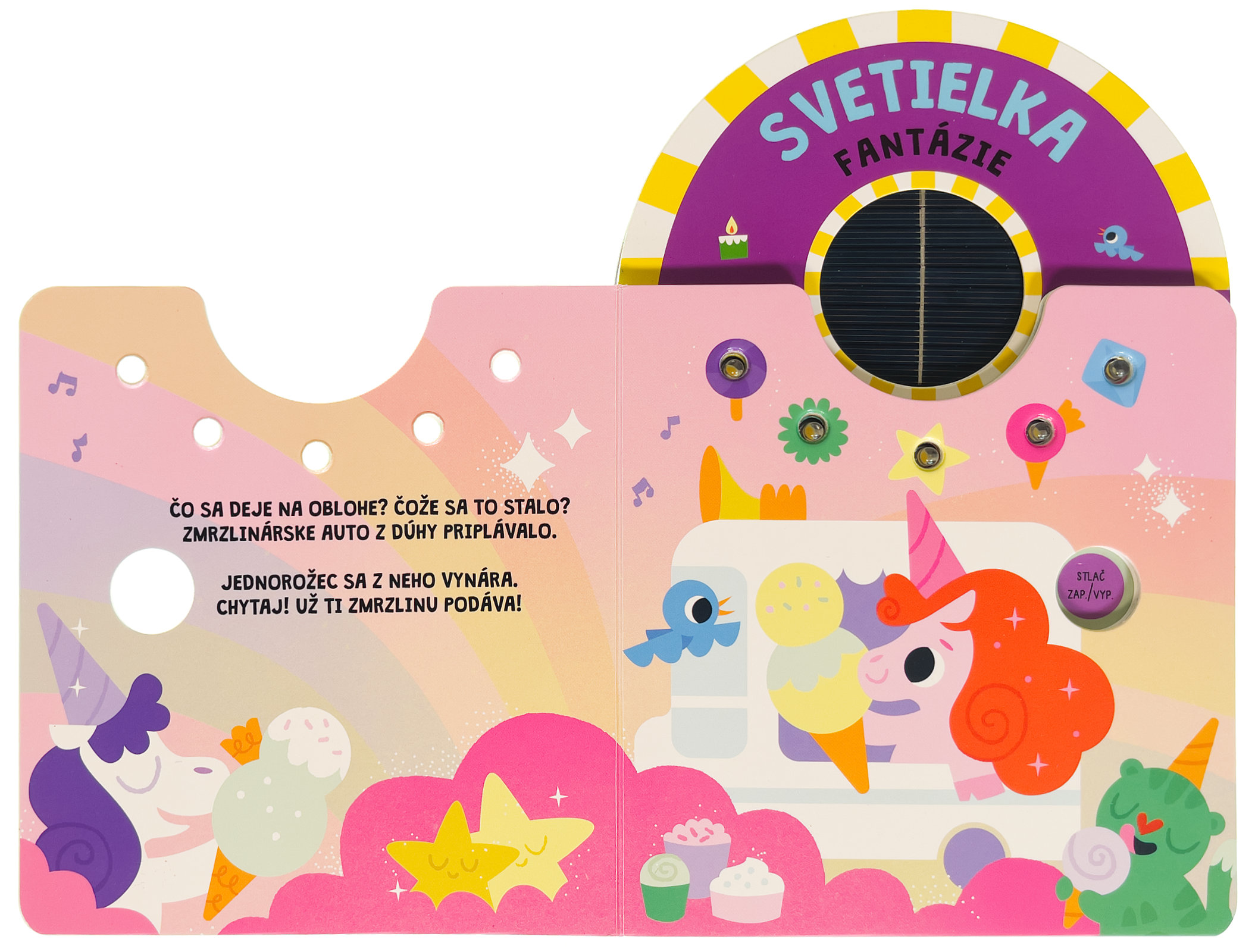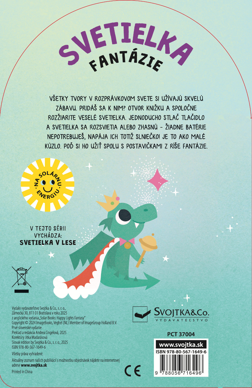 Jednorožec na dúhe, kúzelná líška, princovia i morské víly - svet fantázie ožíva v tejto magickej knižke plnej svetielok. Po stlačení tlačidla sa LED žiarovky jemne rozžiaria nad obrázkami ako svietiace drahokamy, sladkosti či kúzelné paličky. Ich teplé svetlo nebodá do očí, príjemne pomaly bliká a navodzuje pokojnú atmosféru, ideálnu na večerné zaspávanie. Vďaka napájaniu solárnou energiou nie sú potrebné batérie - stačí ju cez deň "nabiť" na slnku a večer stlačiť tlačidlo. Veršované texty a farebné ilustrácie podporia predstavivosť aj radosť zo spoločného čítania.Počet strán: 10