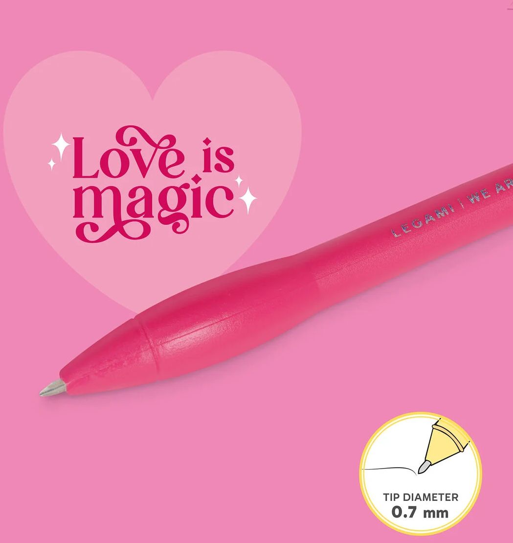 Svietiace pero Legami Writing is Magic s modrým atramentom a 0,7 mm guľôčkovým hrotom sa na niekoľko sekúnd rozsvieti, keď s ním jemne ťuknete o stôl. Samotné srdce je pripravené a čaká na to, aby posvietilo na vaše najjasnejšie nápady!