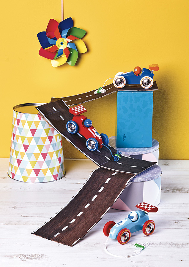 Červeno-modrý závodiak vyrobený z lakovaného dreva s kovovými pogumovanými kolesami a šnúrkou na ťahanie. Dietky si ho môžu vziať kdekoľvek so sebou. Vyrobené vo Francúzsku. Hlavné vlastnosti: podporuje rovnováhu a koordináciu pohybovvyrobené vo Francúzsku