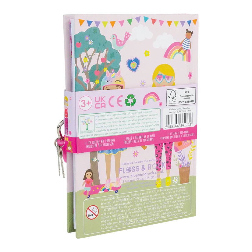 Deník je vybavený visiaci̇m zámkom a kľúčom, vďaka čomu zostanú všetky tajomstvá v bezpečí. Vo vnútri nájdete hárok zábavných nálepiek s motívmi víl, jednorožcov a ďalších rozprávkových bytostí, ako aj záložky s viacfarebnými stuhami. Strany sú linajkové, ideálne na písanie, kreslenie či zapisovanie zážitkov.