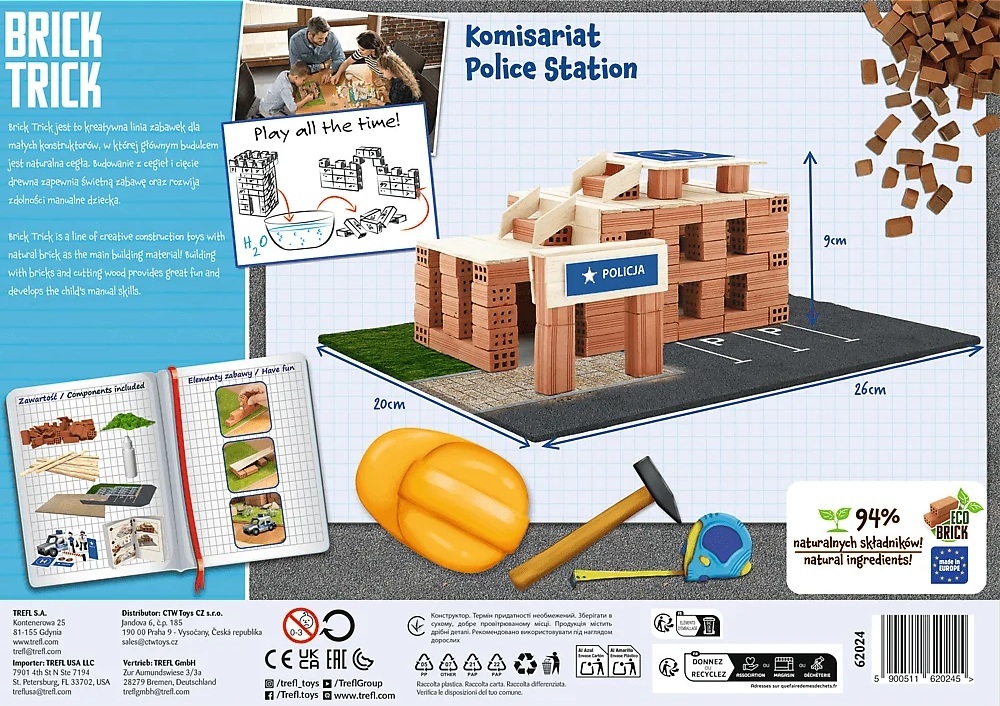Postavte pagodu zo skutočných tehál a dekoratívnych prvkov. S produktmi Brick Trick sa zoznámite s niektorými populárnymi a obľúbenými pamiatkami a hlavne získate možnosť postaviť si ich od základov. Skladajte tehlu za tehlou, režte a lepte dosky, postupujte od základov až po dokončenú budovu a nakoniec svoj výtvor ozdobte priloženými dekoráciami.Stavajte krok za krokom podľa návodu alebo nájdite a zrealizujte svoje vlastné riešenie. Oživte svoju dokončenú stavbu papierovými figúrkami.Pokiaľ spojíte niekoľko sád TREFL Brick Trick, môžete vytvoriť malebnú dedinku, moderné mesto alebo stredovekú osadu.Stavebnicu je možné používať opakovane (lepidlo je rozpustiteľné vodou).Stavebnice Brick Trick od výrobcu TREFL zlepšujú zručnosť, rozvíjajú predstavivosť a podporujú sústredenie.Balenie obsahuje: 100 prírodných hlinených tehličiek, drevené dosky, základovú dosku, ozdobné prvky, lepidlo, obrázkový návod.