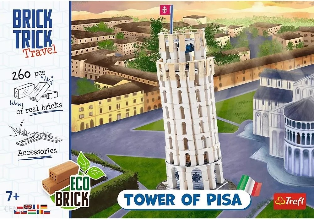 Šikmá veža v Pise je považovaná za symbol Talianska vďaka svojej elegantnej štruktúre z bieleho mramoru a jedinečnému sklonu. Produkt zo série Brick Trick Travel vás zavedie do mesta v Taliansku, kde si vyskúšate prácu staviteľa. Na stavbu používajte skutočné tehly a drevené dosky. Bohato zdobené kartónové prvky môžu byť umiestnené na stenách budovy. Celok dotvoria zvony a vyhliadková plošina. Postavená veža je vysoká 39 cm a celá sada obsahuje 95 prírodných kociek! Vhodné od 7 rokov
