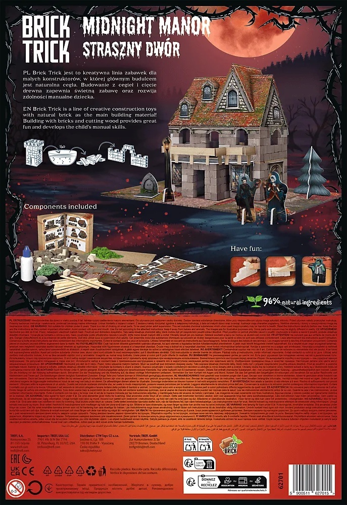 Staňte sa staviteľom a vybudujte zo skutočných hlinených tehál a dreva svoj vlastný stavebný projekt. Skladajte tehlu za tehlou, režte a lepte dosky, postupujte od základov až po dokončenú budovu a nakoniec svoj výtvor ozdobte priloženými dekoráciami.Stavajte krok za krokom podľa návodu alebo nájdite a zrealizujte svoje vlastné riešenie. Oživte svoju dokončenú stavbu papierovými figúrkami.Pokiaľ spojíte niekoľko sád TREFL Brick Trick, môžete vytvoriť malebnú dedinku, moderné mesto alebo stredovekú osadu.Stavebnicu je možné používať opakovane (lepidlo je rozpustiteľné vodou).Stavebnice Brick Trick od výrobcu TREFL zlepšujú manuálne zručnosti, rozvíjajú predstavivosť a podporujú sústredenie.Balenie obsahuje: 220 prírodných hlinených tehličiek drevené dosky lepidlo dekoračné doplnky základovú dosku obrázkový návod