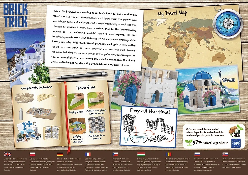 Postavte domček typický pre Santorini zo skutočných tehál a dekoratívnych prvkov.S produktmi z radu Brick Trick Travel sa zoznámite s niektorými populárnymi a obľúbenými pamiatkami a hlavne získate možnosť postaviť si ich od základov. Skladajte tehlu za tehlou, režte a lepte dosky, postupujte od základov až po dokončenú budovu a nakoniec svoj výtvor ozdobte priloženými dekoráciami.Stavajte krok za krokom podľa návodu alebo nájdite a zrealizujte svoje vlastné riešenie. Oživte svoju dokončenú stavbu papierovými figúrkami. Pokiaľ spojíte niekoľko sád TREFL Brick Trick, môžete vytvoriť malebnú dedinku, moderné mesto alebo stredovekú osadu. Stavebnicu je možné používať opakovane (lepidlo je rozpustiteľné vodou). Balenie obsahuje:- viac ako 210 prírodných hlinených tehličiek- drevené dosky- základovú dosku- ozdobné prvky- lepidlo- obrázkový návod Stavebnice Brick Trick od výrobcu TREFL zlepšujú zručnosť, rozvíjajú predstavivosť a podporujú sústredenie.