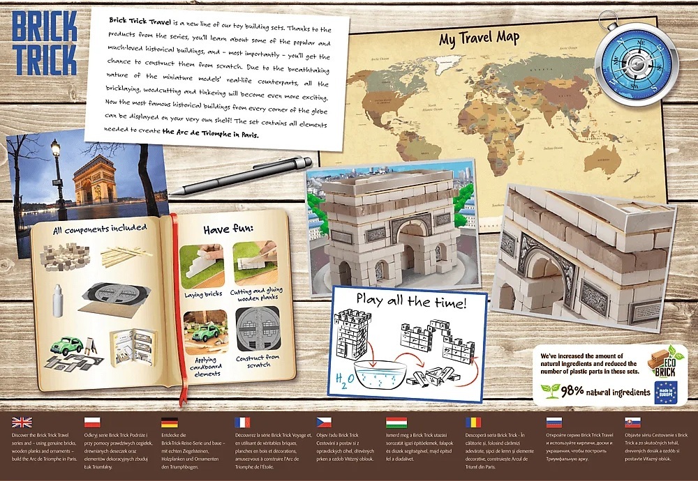 Postavte symbol Paríža - Víťazný oblúk zo skutočných tehál a dekoratívnych prvkov.S produktmi z radu Brick Trick Travel sa zoznámite s niektorými populárnymi a obľúbenými pamiatkami a hlavne získate možnosť postaviť si ich od základov. Skladajte tehlu za tehlou, režte a lepte dosky, postupujte od základov až po dokončenú budovu a nakoniec svoj výtvor ozdobte priloženými dekoráciami.Stavajte krok za krokom podľa návodu alebo nájdite a zrealizujte svoje vlastné riešenie. Oživte svoju dokončenú stavbu papierovými figúrkami. Pokiaľ spojíte niekoľko sád TREFL Brick Trick, môžete vytvoriť malebnú dedinku, moderné mesto alebo stredovekú osadu. Stavebnicu je možné používať opakovane (lepidlo je rozpustiteľné vodou). Úroveň obtiažnosti: 4/5 Balenie obsahuje:- viac ako 290 prírodných hlinených tehličiek- drevené dosky- základovú dosku- ozdobné prvky- samolepku- lepidlo- obrázkový návod Stavebnice Brick Trick od výrobcu TREFL zlepšujú zručnosť, rozvíjajú predstavivosť a podporujú sústredenie.