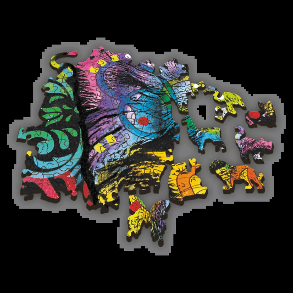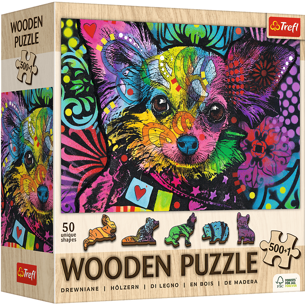 Drevené obojstranné puzzle so špeciálne tvarovanými dielikmi. Puzzle je vyrobené zo silnej drevovláknitej dosky a vyrezané laserom, vďaka čomu sú okraje hladké a dieliky do seba ľahko zapadajú. Vysoká kvalita a precízne spracovanie laserom, až 50 unikátne tvarovaných dielikov, ostatné dieliky v nepravidelných tvaroch, puzzle je obojstranné – z jednej strany obrázok, z druhej strany vzor.