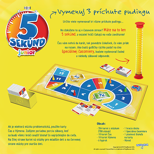 Detská verzia hry, ktorá vás naučí rýchlo myslieť a hovoriť! V tejto hre je vašim cieľom správne odpovedať na čo najviac otázok. Tri rôzne príchute pudingu určite vymenovať zvládnete, ale dokážete to aj pod časovým tlakom? Máte iba 5 sekúnd a ostatní hráči netrpezlivo čakajú na vaše zaváhanie! Hra obsahuje kartičky s otázkami v dvoch farbách- žlté pre mladšie deti a červené pre staršie. Vek 6+