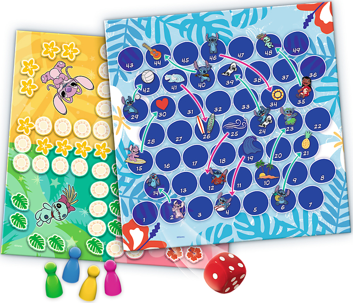 Sada spoločenských hier 2v1 - obsahuje Človeče, nehnevaj sa! a Hady&rebríky.Klasická stolová hra pre celú rodinu s motívom hrdinov animovaného seriálu Lilo +amp; Stitch. Postav figúrky do štartovacieho domčeka. Počkaj až hodíš na kocke šestku a môžeš vyraziť. Tvojou úlohou je dostať všetky tvoje figúrky až do cieľového domčeka. Daj pozor, aby ťa cestou súperovi nevyhodili späť na štart! Zvoľte si figúrku a dajte sa do veľkých pretekov. Po ceste čakajú rôzne prekvapenia – buď sa budete musieť vrátiť alebo budete môcť preskočiť niekoľko políčok a posunúť sa tak dopredu. Úlohou je doraziť do cieľa ako prvý. Balenie obsahuje: hrací plán 16 figúrok v 4 rôznych