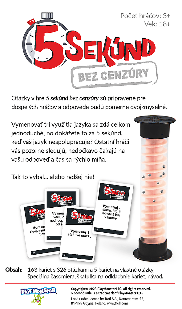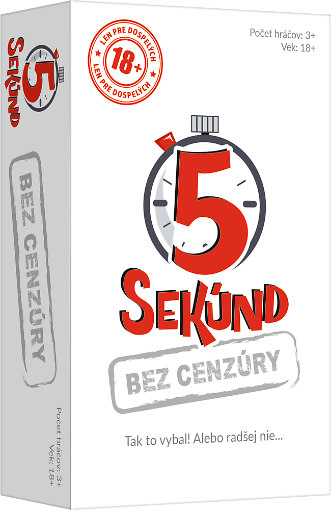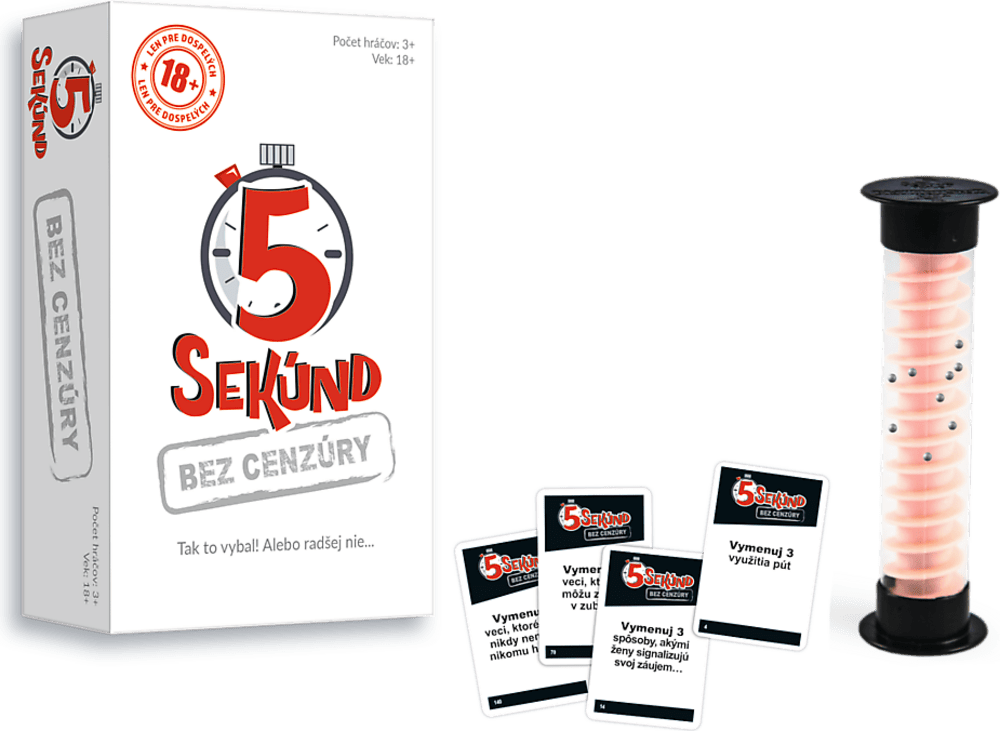 Neslušná dávka súťaženia, adrenalínu a smiechu. Len pre dospelých! Pikantná kombinácia jednoduchých pravidiel, dynamickej hrateľnosti a kontroverzných otázok. Všetci behom okamihu pochopia pravidlá! Jedna osoba prečíta otázku, druhá odpovie a má na to iba 5 sekúnd. Pravidlá sú jednoduché, ale vymenovať tri správne odpovede na nejednoznačné otázky počas piatich sekúnd je celkom problém. Zvlášť pokiaľ sa z vecí, ktoré vám napadnú, budete červenať a rozpaky vám uväznia odpovede v krku. Raz, dva, tri, štyri, päť a je to! Čas sa kráti! Aj zdanlivo jednoduché otázky môžu hráča omráčiť.