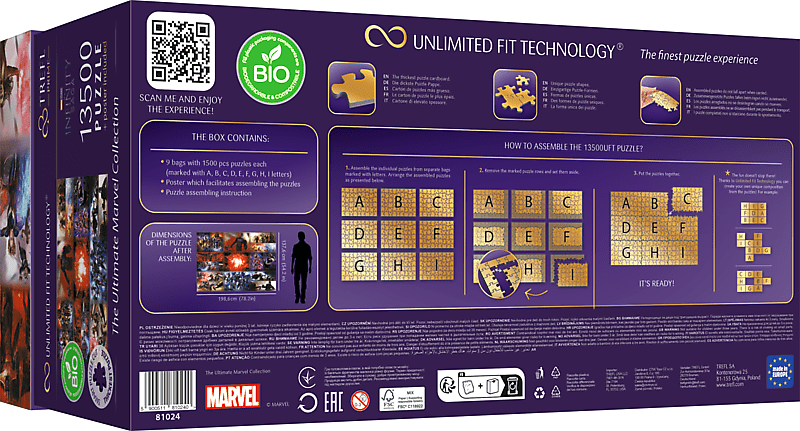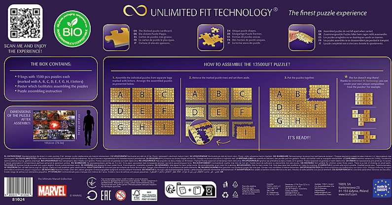 TREFL Unlimited Fit Technology (UFT) sú puzzle neobmedzených možností. Vďaka tejto technológií si môžete z viac obrázkov poskladať veľké puzzle koláže. technológia umožňuje napájanie ľubovoľného množstva puzzle motívov zo série UFT najvyššia kvalita - puzzle vyrobené z najsilnejšieho modrého kartónového podkladu každý dielik má unikátny tvar Puzzle dieliky držia pri sebe a poskladané obrázky je možné pohodlne premiestňovať rozmer: 198,6 x 137,6 cm 1 dielik: 1,4 cm Kadý obrázok balený samostatne 9x1500 dielikov. Balené v bio obale – bez vrchnej fólie. Sáčok vo vnútri je biologicky rozložiteľný.