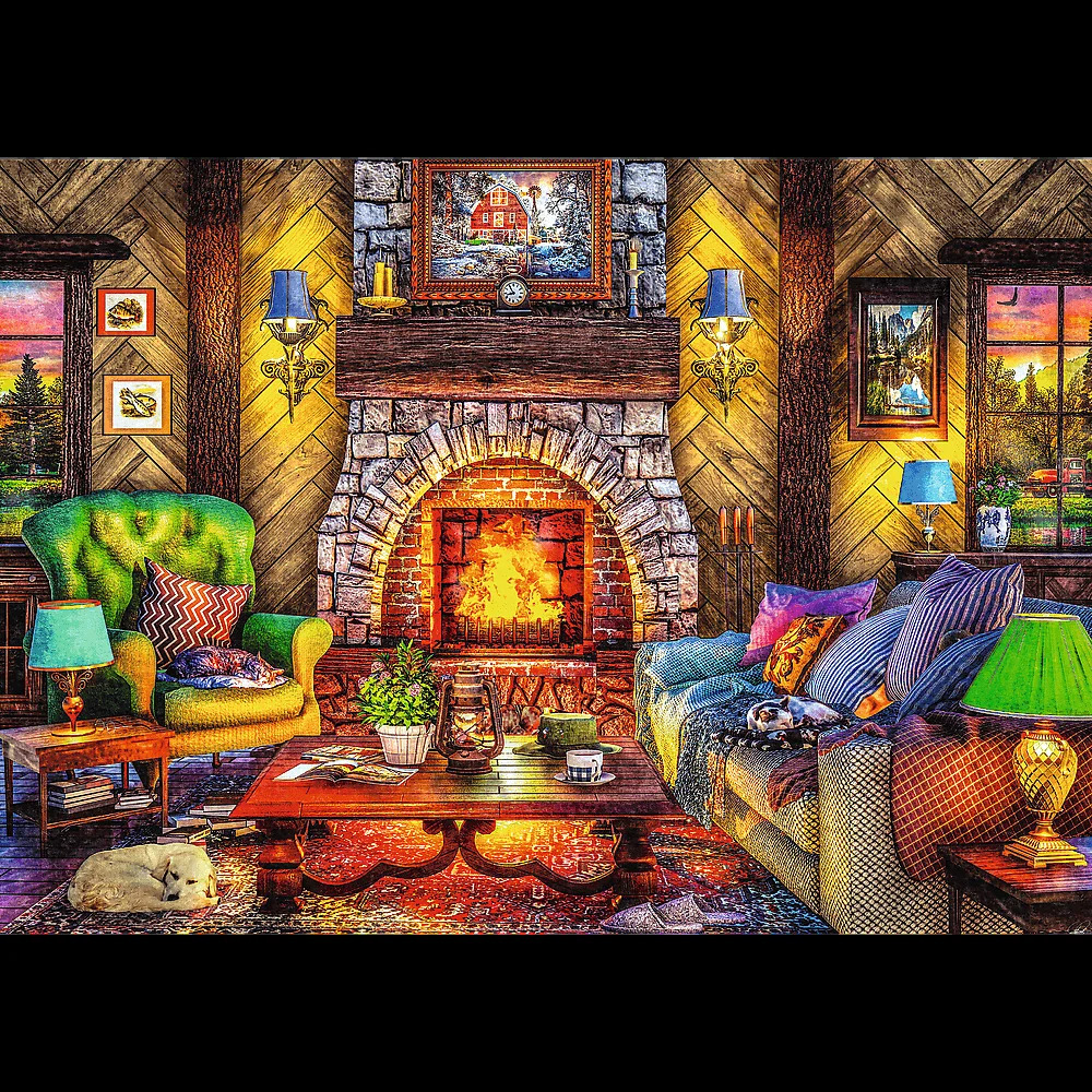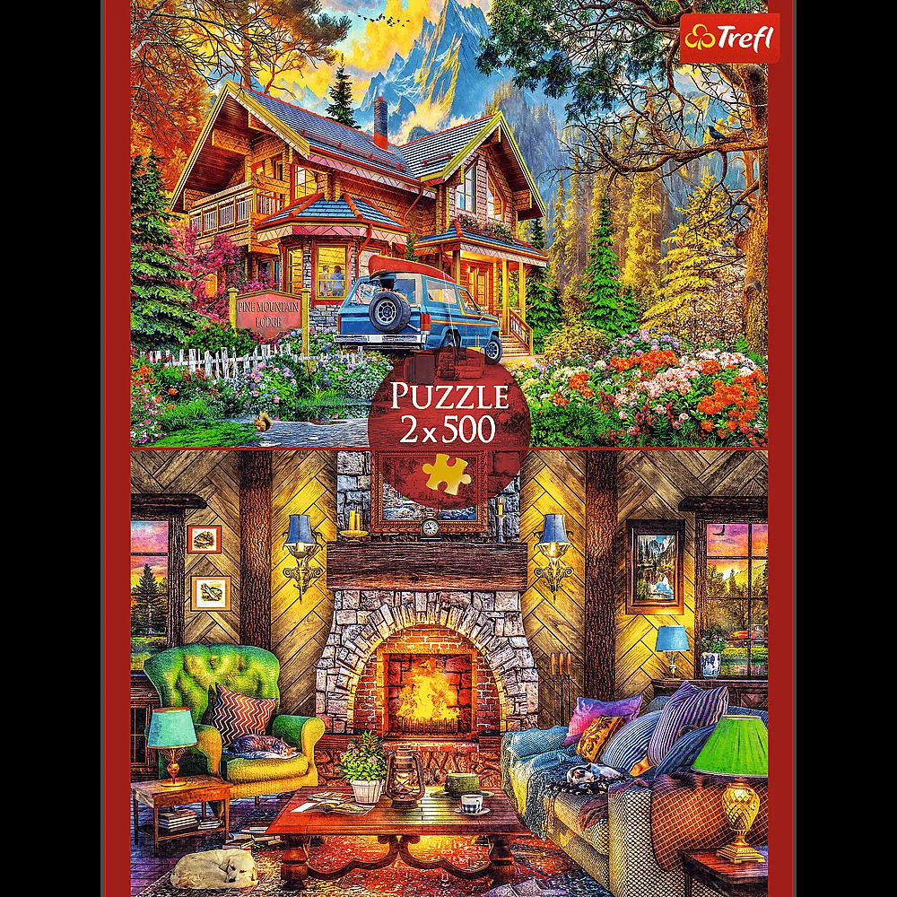 Puzzle 2x500 sú dve 500-dielne puzzle v jednom balení ! Výlet do hôr je skladačka zobrazujúca dom na pozadí hôr a interiér chaty s krbom. Každá skladačka vytvorí obrázok s rozmermi 480x340 mm.