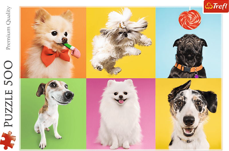 Trefl Psy sú puzzle s 500 kusmi v koláží roztomilých psíkov rôznych plemien na farebnom pozadí. Po zložení sa vytvorí obrázok s rozmermi 48 x 34 cm. Vysoko kvalitný, sýtosť farieb a bezpečné stohovanie je zabezpečené kalandrovaným reflexným papierom potiahnutým ekologickými potravinárskymi farbami Vek 10+