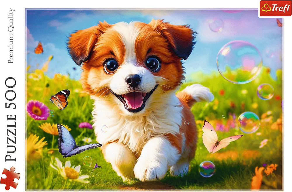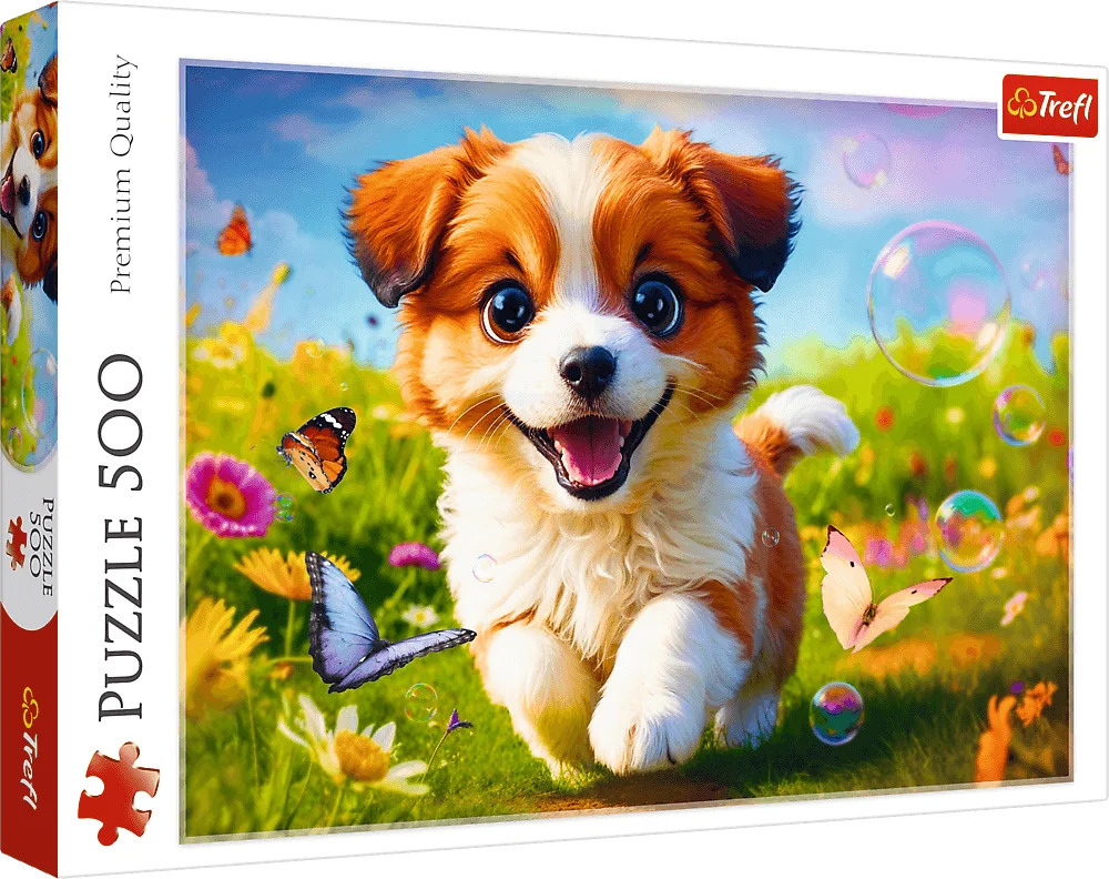 Puzzle Šťastné šteňa pozostáva z 500 prvkov a predstavuje roztomilé šteniatko. Hotové puzzle má rozmery 480x340 mm. Výrobok bol vyrobený v Poľsku z vysoko kvalitných materiálov a šetrne k životnému prostrediu. Ďalej je puzzle potiahnuté špeciálnym kalandrovaným papierom, ktorý odráža svetlo, čo uľahčuje jeho skladanie.