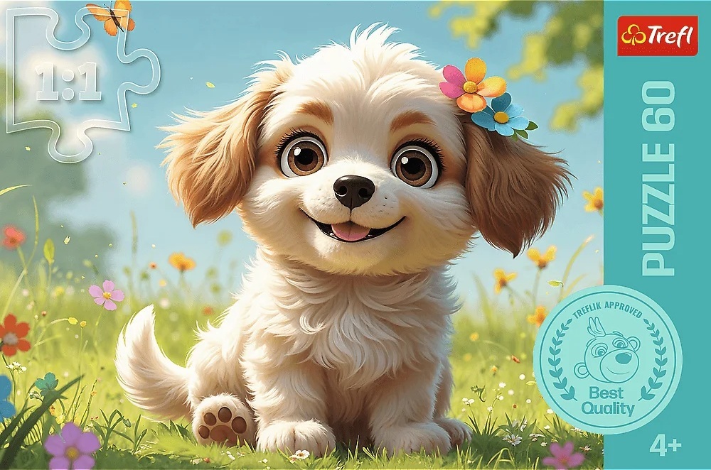 60-dielna skladačka navrhnutá pre mladých fanúšikov zvierat. Skladačka zobrazuje usmiate šteniatko na lúke. Po zostavení má výsledný obrázok rozmery 330 x 220 mm.