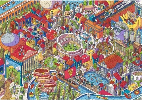 Rome - Prime puzzle zo série Eye-Spy UFT. Puzzle sa skladá z 1000 prvkov a umožňuje vám spojiť ľubovoľný počet hádaniek do jednej koláže! Imaginary Cities vás zavedú do bláznivého a abstraktného Ríma, kde je možné všetko. Skočte do bláznivého sveta ilustrácií s hádankami Eye-Spy! Séria pozostáva z dvoch tematických skupín – Imaginary Cities a Sneaky Peakers. Ilustrácie boli pripravené mimoriadne precízne a detaily v nich ukryté vedia prekvapiť. Pozrite sa pozorne na každý obraz a nájdite scény plné humoru! Puzzle zo série Eye-Spy boli vyrobené pomocou technológie Unlimited Fit a kvality Trefl Prime. Vyznačujú sa: najhrubší puzzle kartón biodegradovateľná a kompostovateľná fólia na krabici vo forme nálepiek a ako sklzový vak možnosť kombinácie ľubovoľného počtu vzorov v skupine; vytvorte si vlastnú individuálnu koláž zvláštny, nepravidelný tvar skladačky zložitú hádanku je možné presúvať; dokončené hádanky sa nerozpadajú Vek: 12+