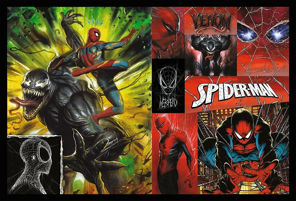 Puzzle 2x200 sú dve 200-dielne puzzle v jednom balení! Spiderman Day and Night sú hádanky predstavujúce koláže s hrdinami z univerza Marvel: Spiderman a Venom. Každé puzzle vám umožní vytvoriť obrázok s rozmermi 410x275 mm. Produkt bol vyrobený v Poľsku so starostlivosťou o životné prostredie a s použitím kvalitných materiálov s certifikátom FSC a fólia na obale bola nahradená nálepkami. Vek: 7+