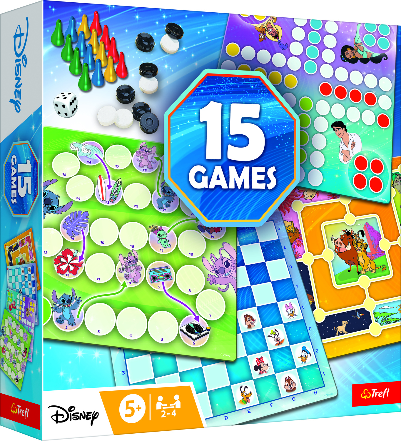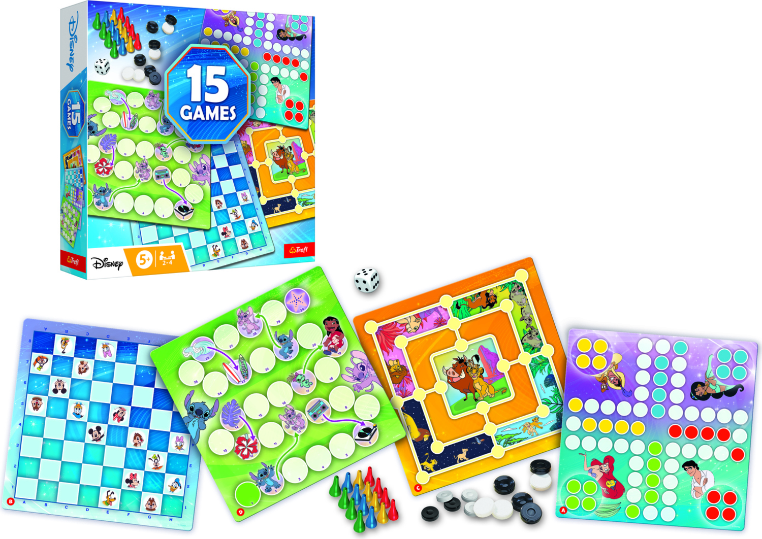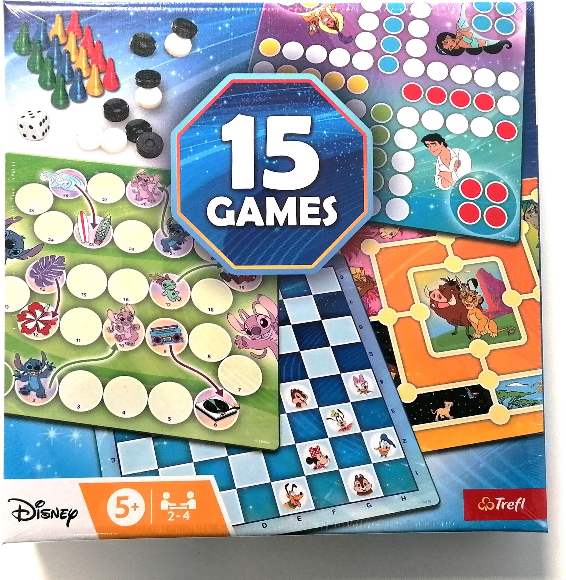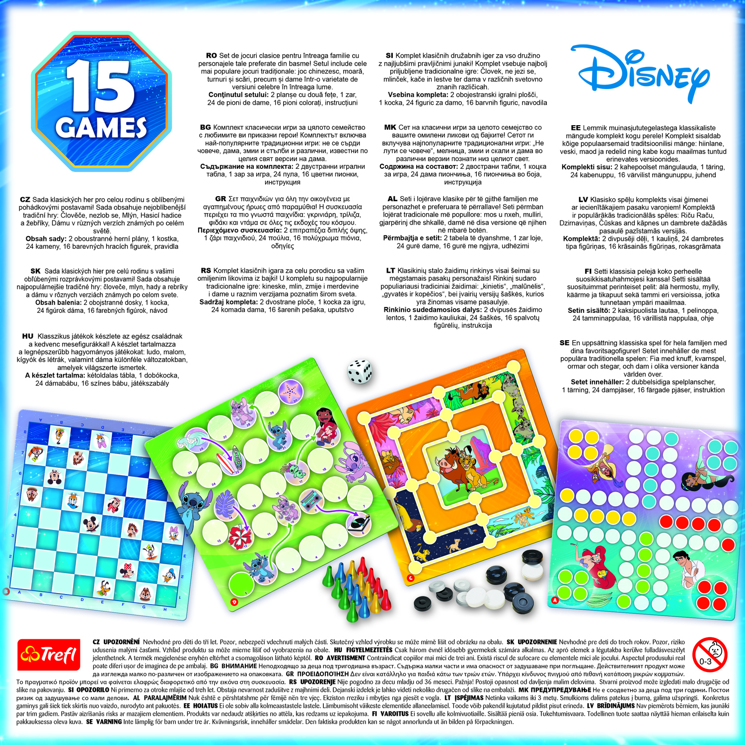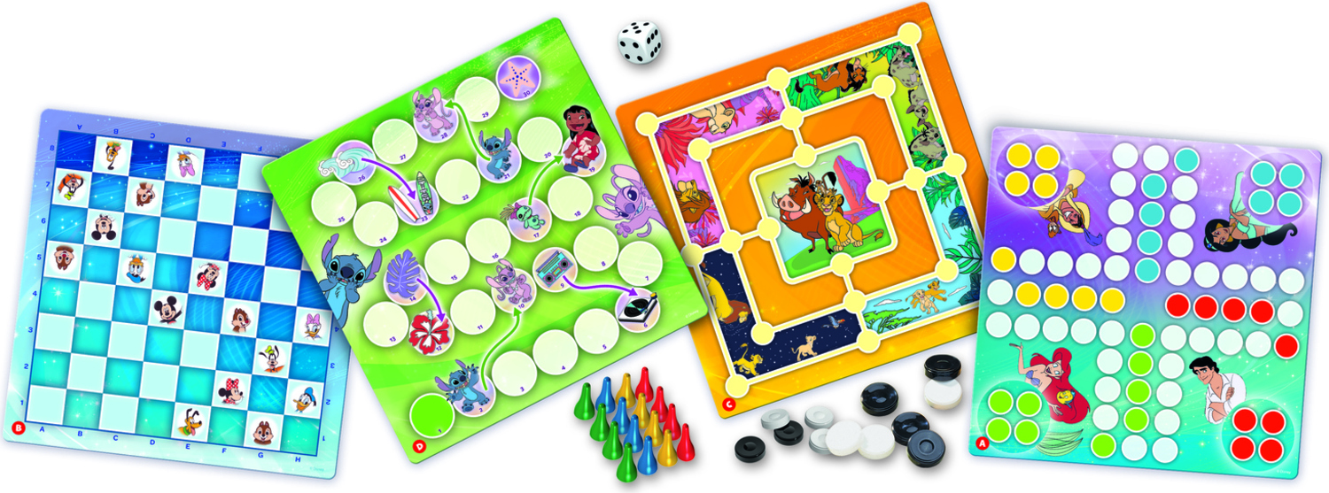 Sada klasických hier pre celú rodinu s vašimi obľúbenými rozprávkovými postavami! Sada obsahuje tradičné hry: človeče, mlyn, hady a rebríky a dámu v rôznych verziách známych po celom svete.Obsah balenia: 2 obojstranné dosky 1 kocka 24 figúrok dáma 16 farebných figúrok návod Počet hráčov: 2-4 Vek: 5+