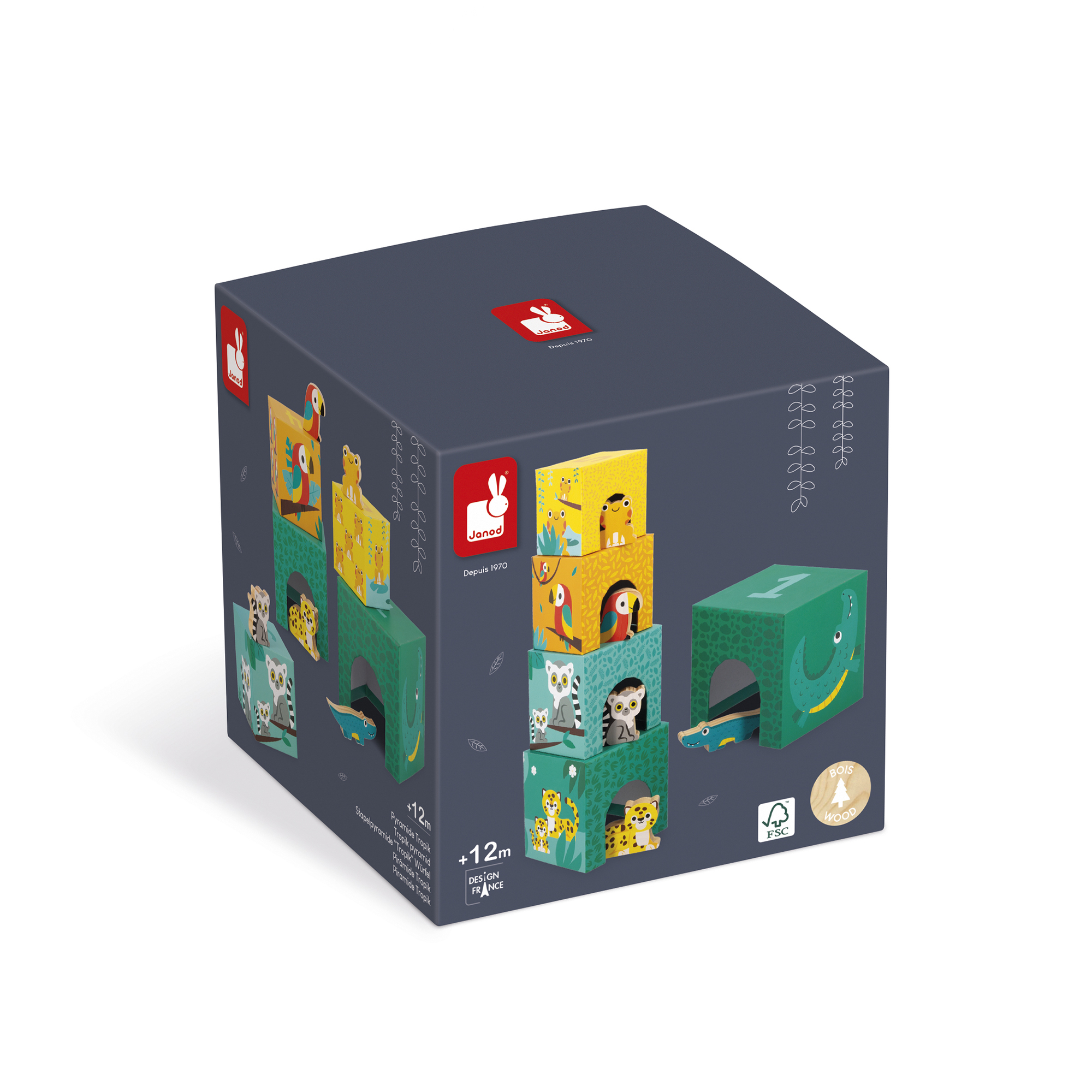 Vitajte v džungli! Tu je naša atraktívna pyramída zložená z 5 kartónových blokov a 5 drevených zvieratiek (krokodíl, jaguár, lemur, papagáj a žaba). Každá kocka predstavuje zviera rôznej veľkosti a je očíslovaná od 1 do 5, aby sa deti mohli učiť počítať a zároveň sa baviť! Na boku počet zvieratiek zodpovedá číslu na kocke. Nakoniec, vďaka ilustráciám a otvorom, vaše dieťa bude môcť nájsť, ktorá kocka patrí ktorému zvieraťu a schovať ju dovnútra. Rozvíja jemnú motoriku a koordináciu ruka-oko. Hračka vyrobená z dreva a kartónu s certifikátom FSCTM pre deti od 12 mesiacov.