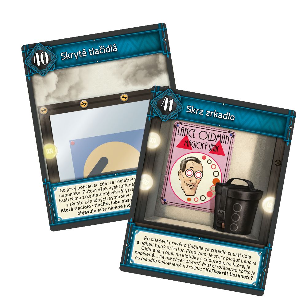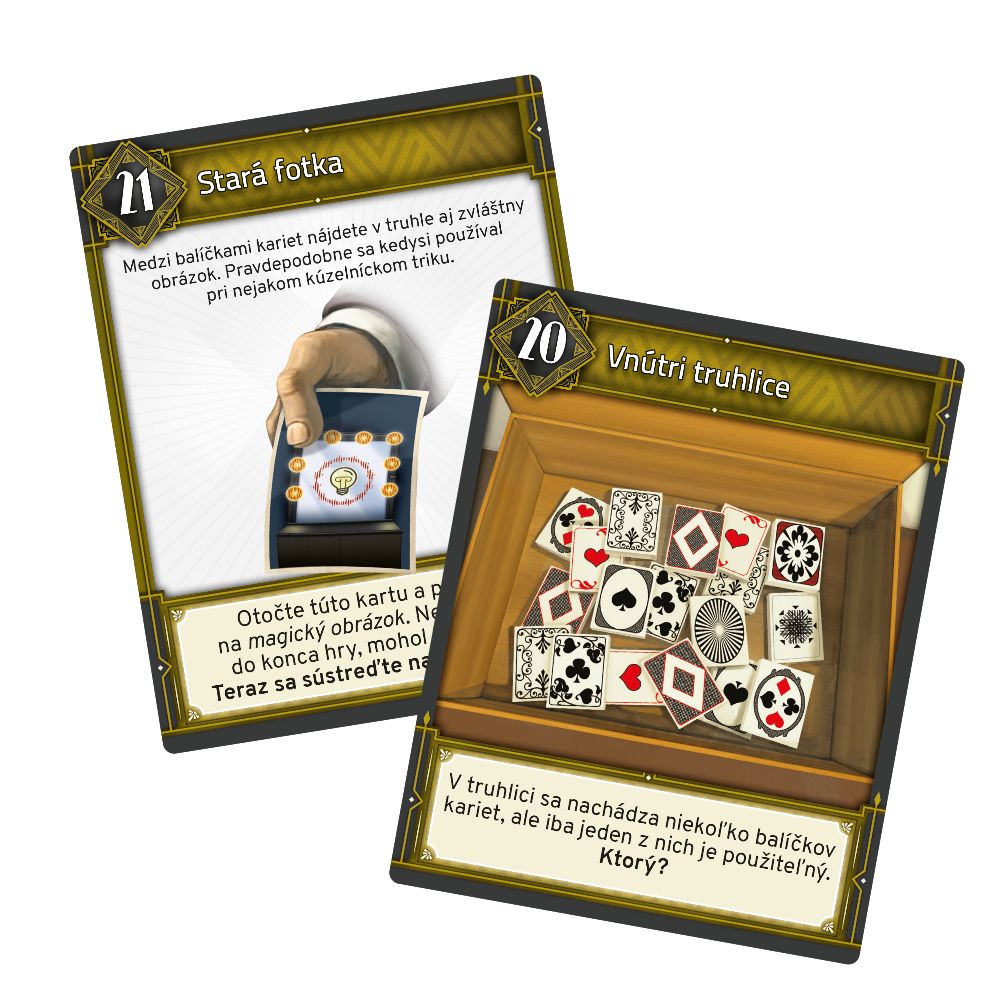 Anonymná obálka vo vašej schránke obsahuje voľné vstupenky na beznádejne vypredanú poslednú kúzelnícku show veľkého iluzionistu Lance Oldmana. Show sa bude konať dnes večer v New Yorku. Už sa nemôžete dočkať: pred vami sa rysuje zábavný a pohodový večer… ale pokiaľ si začnete s mágiou, musíte sa pripraviť na čokoľvek! Zaujmite svoje miesta v hľadisku a akonáhle začnete prichádzať na kĺb niektorým kúzelnickým trikom, show naberie nečakané obrátky! Únikovka je kartovou variáciou na populárne únikové hry, pri ktorých sa skupina priateľov alebo kolegov (možno hrať aj ako jeden hráč) nechá zamknúť do miestnosti plnej rébusov a snaží sa z nej v časovém limite uniknúť preč. Aj kartová hra Únikovka je plná rébusov, ktoré musíte vyriešiť, pokiaľ chcete uspieť. A uspejete alebo zlyháte všetci - Únikovka je totiž kooperatívna hra, teda hrajú všetci hráči spolu a nie proti sebe. Hráči spoločne prechádzajú balíčkom kariet, čím sa im odhaľujú nové pravidlá a nové rébusy. Niektoré karty predstavujú hlavolamy, iné nápovede a ďalšie predmety, ktoré sa hodia neskôr. Zvládnete vyriešiť unikátne rébusy a uniknúť z miestnosti včas? Upozornenie: Hry Únikovky môžete hrať plnohodnotne iba raz (pri opakovanom hraní už budete poznať riešenie rébusov). Darujte ju po odohraní priateľom a porovnajte si svoje výsledky. Hra Únikovka - Za oponou obsahuje: 60 veľkých kariet.