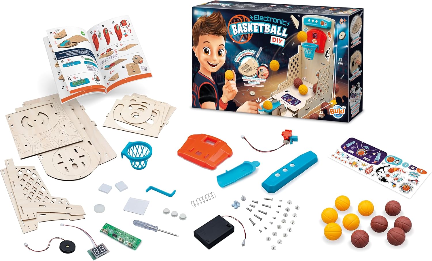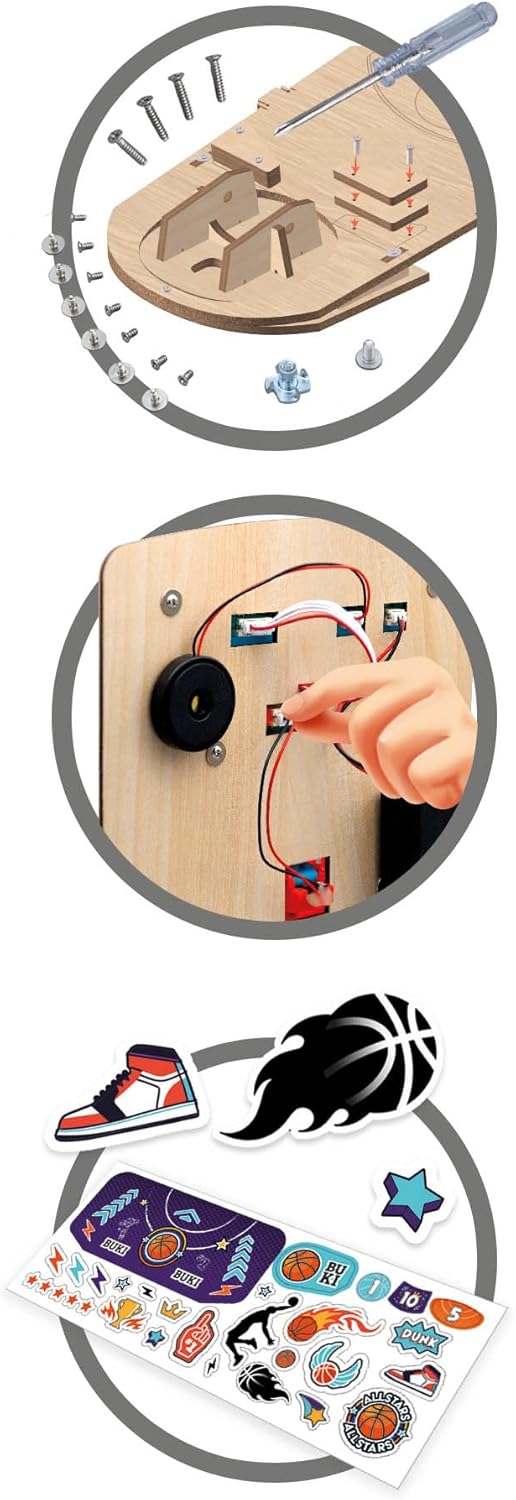 Zostav si vlastný interaktívny basketbalový kôš a hoď sa do súťaženia! Tento stavebný set spája praktické zručnosti (montáž bez nutnosti spájkovania) s elektronikou — výsledkom je malý stolný kôš s elektronickým displejom, zvukmi a počítadlom bodov, ktorý ocenia deti aj začínajúci hráči.