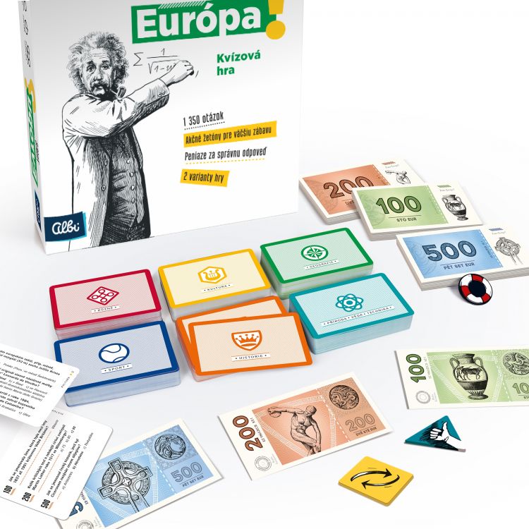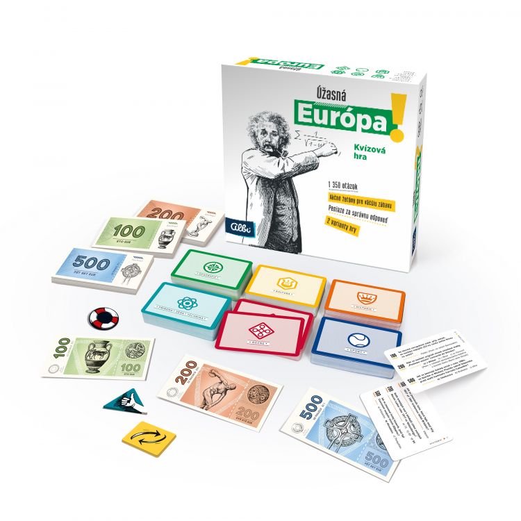 Kvízová hra Úžasná Európa! otestuje vaše znalosti o našom kontinente naprieč 6 rôznymi kategóriami - história, geografia, príroda/veda/technika, kultúra, šport a rôzne. Celkom na vás čaká 1350 otázok, ich náročnosť si však môžete zvoliť sami. Každá otázka v hre je ocenená finančným obnosom, ktorý môžete vyhrať, pokiaľ na ňu správne odpoviete. Odvážnejší hráči môžu zvoliť aj akčný variant hry Úžasná Európa!. Stavte si žetóny na spoluhráča alebo si od neho nechajte poradiť a peniaze zarobíte obaja. Pomocou žetónu môžete aj zmeniť hodnotu otázok, a tým napríklad aj zvrátiť výsledok hry. HERNÝ MECHANIZMUS: Pred začiatkom hry vyložíte na stôl 6 kôpok kariet - 1 kôpka pre každú kategóriu (počet kariet v kôpke sa určuje podľa počtu hráčov). Kolo začína najmladší hráč – vyberie si z ktorej kategórie mu bude položená otázka a v akej hodnote (otázka za 100, 200 alebo 500 dolárov). Ak odpovie správne, získava danú hodnotu peňazí. Ak nie, nezískava nič. Použitá karta sa vyradí z hry a rovnakým spôsobom pokračuje ďalší hráč. Kolo končí keď zahrajú všetci hráči. Do ďalšieho kola sa na stôl vykladajú nové kôpky kariet. V každom ďalšom kole začína hráč po ľavici predošlého hráča. Počet kôl závisí od počtu hráčov. Vyhráva hráč, ktorý sa obohatí o čo najväčšie množstvo znalostí (má najväčší finančný obnos). OBSAH HRY: 400 kariet s 1350 otázkami 18 akčných žetónov bankovky v hodnote 100, 200 a 500 dolárov Pravidlá v slovenčine PARAMETRE PRODUKTU: Rozmery krabice: 20,5 cm x 20,5 cm x 6 cm