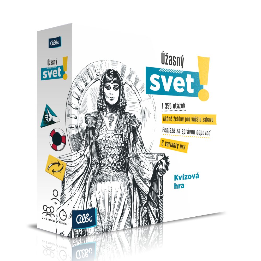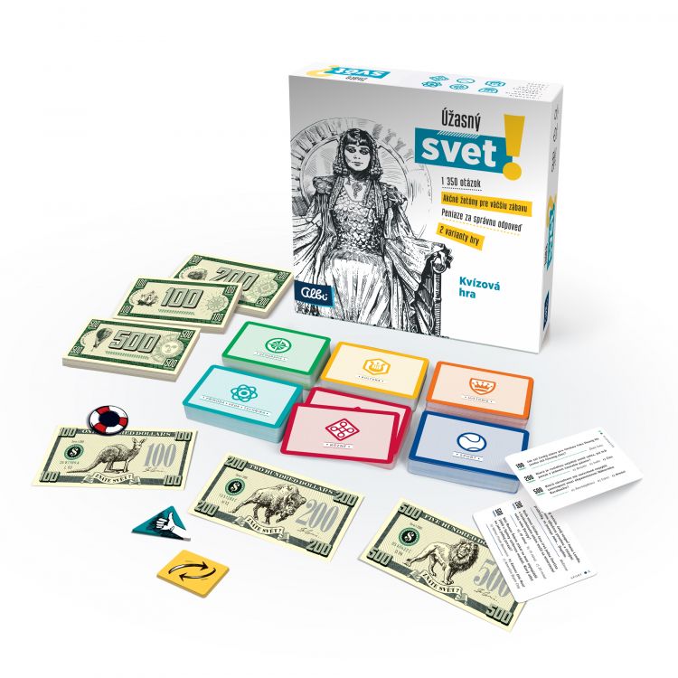 Kvízová hra Úžasný svet! otestuje vaše znalosti o našej planéte naprieč 6 rôznymi kategóriami - história, geografia, príroda/veda/technika, kultúra, šport a rôzne. Celkom na vás čaká 1350 otázok, ich náročnosť si však môžete zvoliť sami. Každá otázka v hre je ocenená finančným obnosom, ktorý môžete vyhrať, pokiaľ na ňu správne odpoviete. Odvážnejší hráči môžu zvoliť aj akčný variant hry Úžasný svet!. Stavte si žetóny na spoluhráča alebo si od neho nechajte poradiť a peniaze zarobíte obaja. Pomocou žetónu môžete aj zmeniť hodnotu otázok, a tým napríklad aj zvrátiť výsledok hry. HERNÝ MECHANIZMUS: Pred začiatkom hry vyložíte na stôl 6 kôpok kariet - 1 kôpka pre každú kategóriu (počet kariet v kôpke sa určuje podľa počtu hráčov). Kolo začína najmladší hráč – vyberie si z ktorej kategórie mu bude položená otázka a v akej hodnote (otázka za 100, 200 alebo 500 dolárov). Ak odpovie správne, získava danú hodnotu peňazí. Ak nie, nezískava nič. Použitá karta sa vyradí z hry a rovnakým spôsobom pokračuje ďalší hráč. Kolo končí keď zahrajú všetci hráči. Do ďalšieho kola sa na stôl vykladajú nové kôpky kariet. V každom ďalšom kole začína hráč po ľavici predošlého hráča. Počet kôl závisí od počtu hráčov. Vyhráva hráč, ktorý sa obohatí o čo najväčšie množstvo znalostí (má najväčší finančný obnos). OBSAH HRY: 400 kariet s 1350 otázkami 18 akčných žetónov bankovky v hodnote 100, 200 a 500 dolárov Pravidlá v slovenčine PARAMETRE PRODUKTU: Rozmery krabice: 20,5 cm x 20,5 cm x 6 cm
