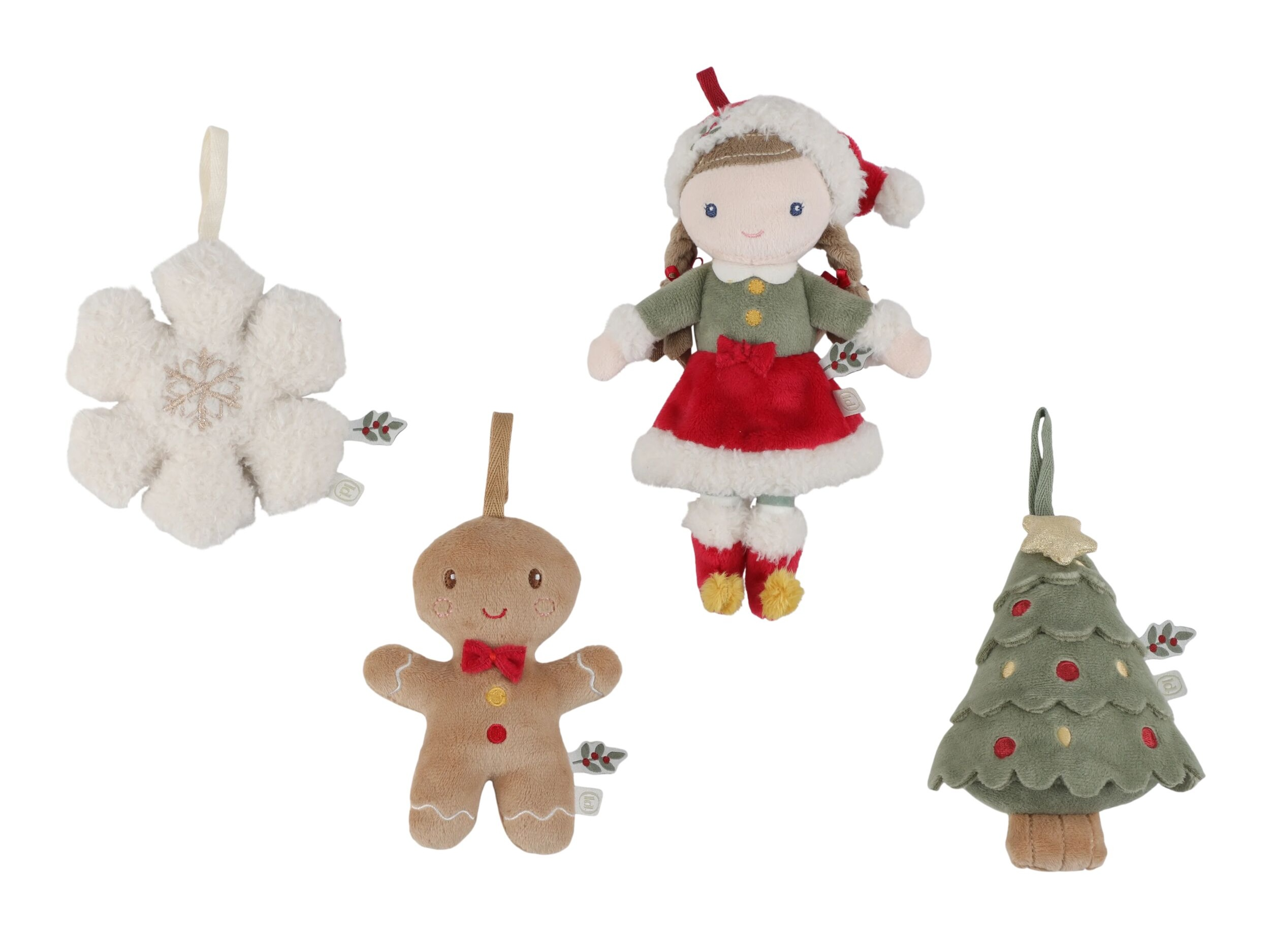 Roztomilá sada čtyř plyšových ozdob Little Dutch vnese do vašeho domova hřejivou atmosféru Vánoc. V dárkovém balení najdete panenku Rosu ve vánočním oblečení, usměvavého perníčka, vánoční stromeček a sněhovou vločku. Díky měkkému a lehkému materiálu jsou ozdoby bezpečné pro malé děti a snadno se věší na vánoční stromek, větvičku nebo girlandu. Společné zdobení stromku se tak stane kouzelným rodinným okamžikem, který si budete užívat rok co rok.