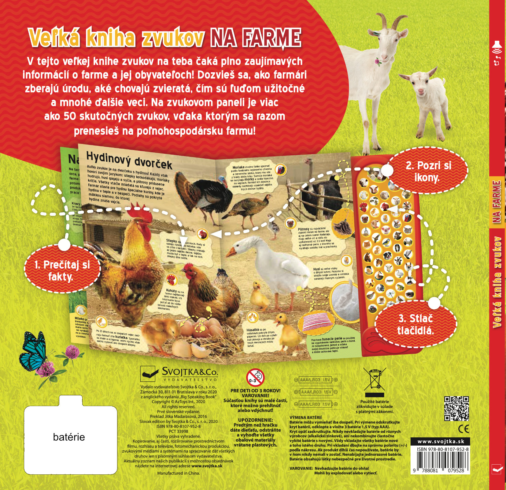 V tejto knihe nájdete o farme a jej obyvateľoch mnoho zaujímavých informácií! Dozviete sa, ako farmári žnú úrodu, chovajú zvieratá, ako sú jednotlivé zvieratá ľuďom užitočné a mnohé ďalšie veci. Čítanie a prezeranie si môžete spestriť viac ako päťdesiatimi skutočnými zvukmi. Na každej stránke nájdete plno fotografií zo života na farme. Pri jednotlivých výjavoch sú obrázkové ikony a zaujímavé fakty, a ak na zvukovom paneli nájdete rovnaký obrázok a stlačíte ho, hneď sa ocitnete uprostred hlučnej farmy. Zabavte sa s touto veľkou knihou zvukov a naučte sa o živote farmy niečo nové! Kniha obsahuje tri výmenné batérie.
