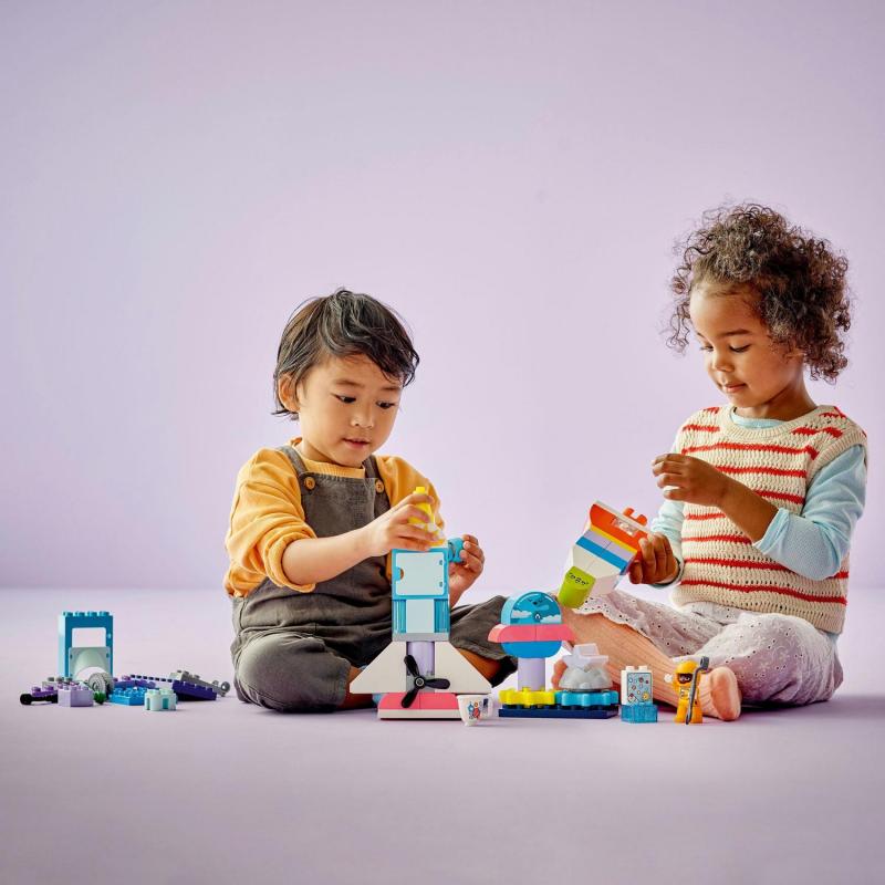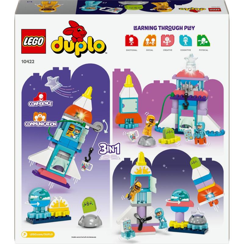 3... 2... 1... štart! Vydajte sa na akčnú výpravu so stavebnicou Vesmírne dobrodružstvo s raketoplánom 3 v 1 (10422) na stavanie a prestavovanie. Predstavivosť detí od 3 rokov naberie nové obrátky počas hry na astronautov skúmajúcich galaxiu z hračkárskej vesmírnej lode, ktorí cestou spoznávajú mimozemšťanov a učia sa o slnečnej sústave. Táto vesmírna hračka je vybavená zábavnými doplnkami, ktoré podporujú kreatívnu hru. Deti od 3 rokov objavia nové obzory popri vymýšľaní zábavných vesmírnych dobrodružstiev pre 2 figúrky astronautov LEGO® DUPLO®, ako napríklad stretnutia s mimozemšťanmi či vesmírne prechádzky, počas ktorých opravia raketu hračkárskym kľúčom. S touto flexibilnou stavebnicou 3 v 1, ktorá obsahuje množstvo zaujímavých kociek a prvkov, ktoré sa dajú prestavať na 2 ďalšie hračkárske vesmírne vozidlá, základňu planéty alebo čokoľvek iné, čo si batoľatá vymyslia, bude čas hry vždy plný prekvapení! Zábavná vzdelávacia hračka s otáčajúcimi sa ozubenými kolieskami, rotujúcou vrtuľou, funkčným navijakom, výklopnými dverami a svetelnou kockou pomáha predškolákom rozvíjať aj zručnosti jemnej motoriky.