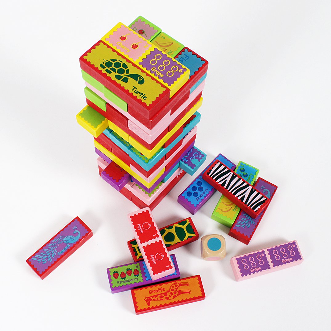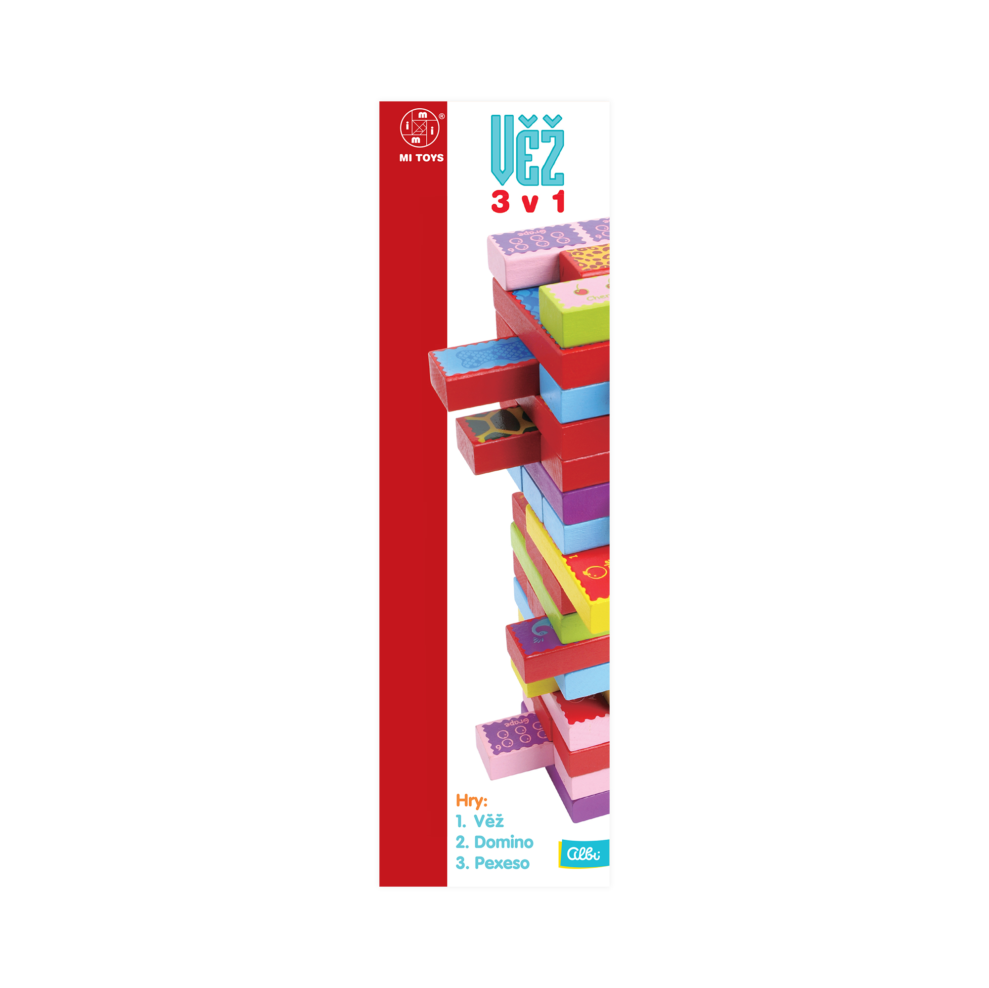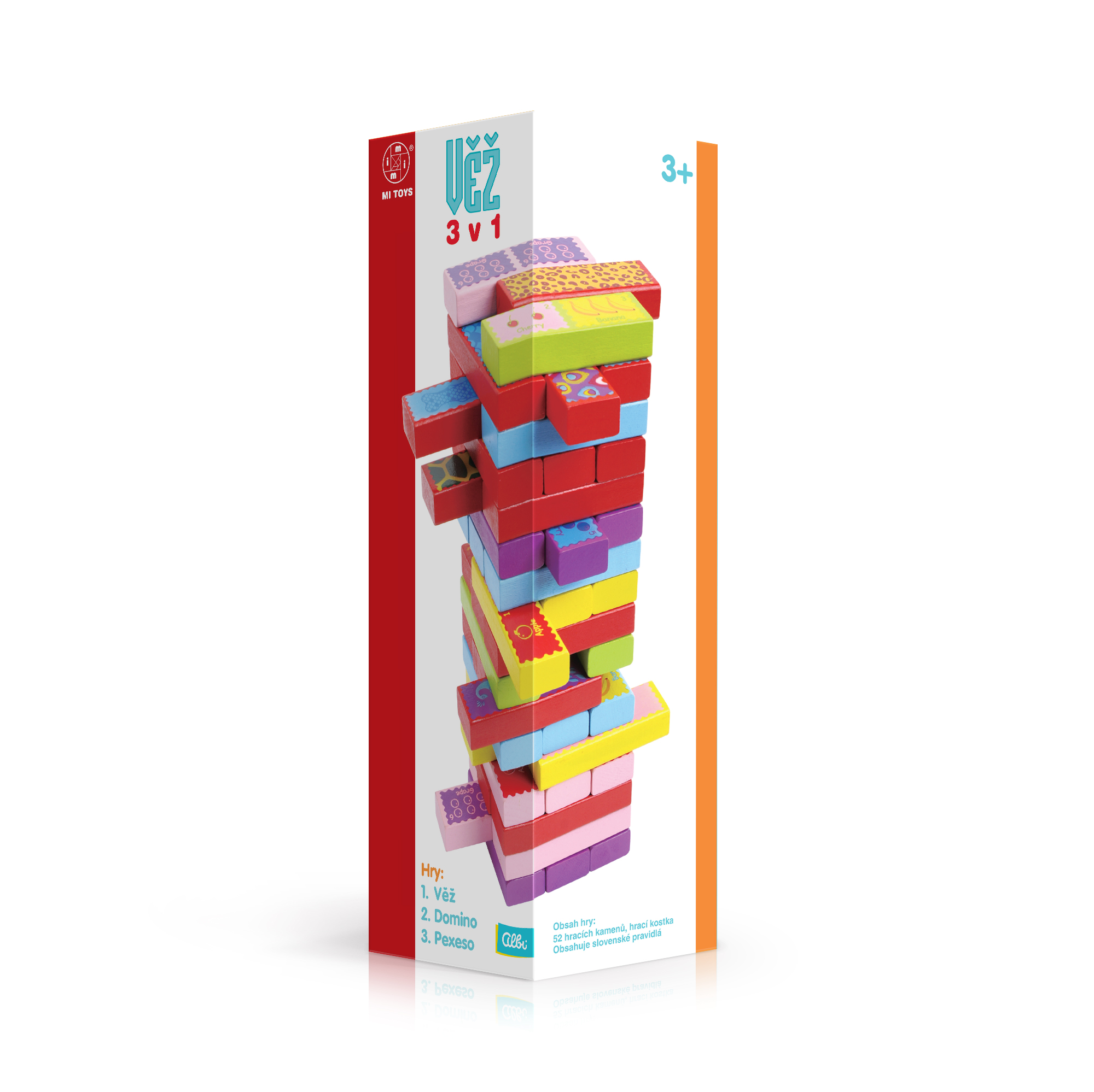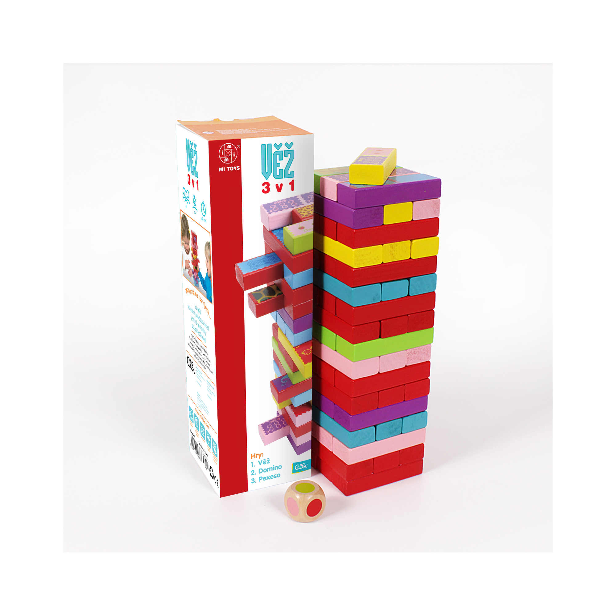 Drevená hra Veža kedysi známa tiež ako "Jenga" pomáha rozvíjať jemnú detskú motoriku a sústredenosť. S farebnými drevenými kameňmi z Veže je možné hrať tiež pexeso a domino. Pexeso je skvelou cestou ako trénovat pamať detí, ale aj dospelých. K dominu je potrebné trochu tej vizuálnej predstavivosti, ale zato si poriádne zasúťažíte! Hra obsahuje: 52 hracích kameňov, hraciu kocku a pravidlá.