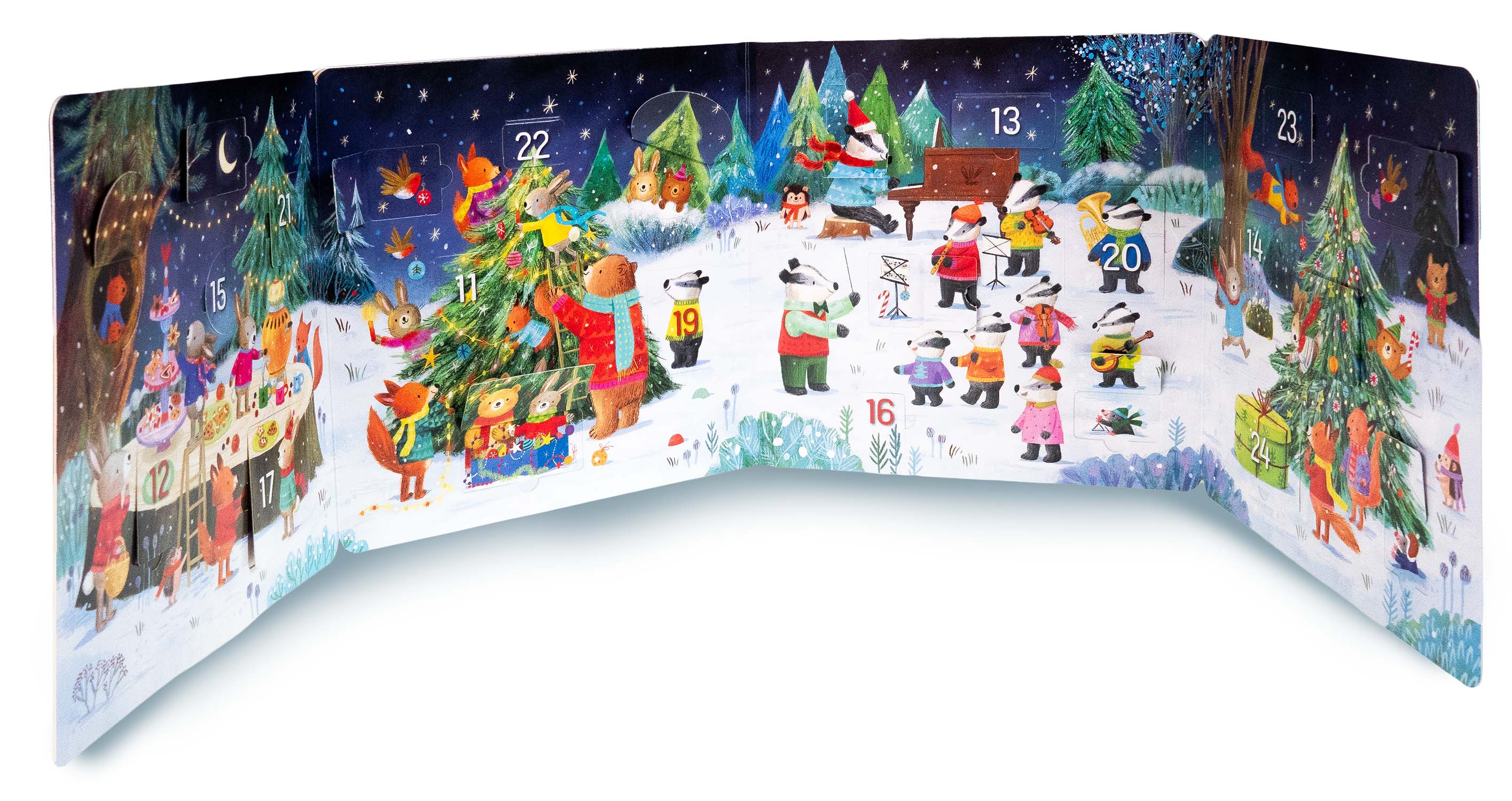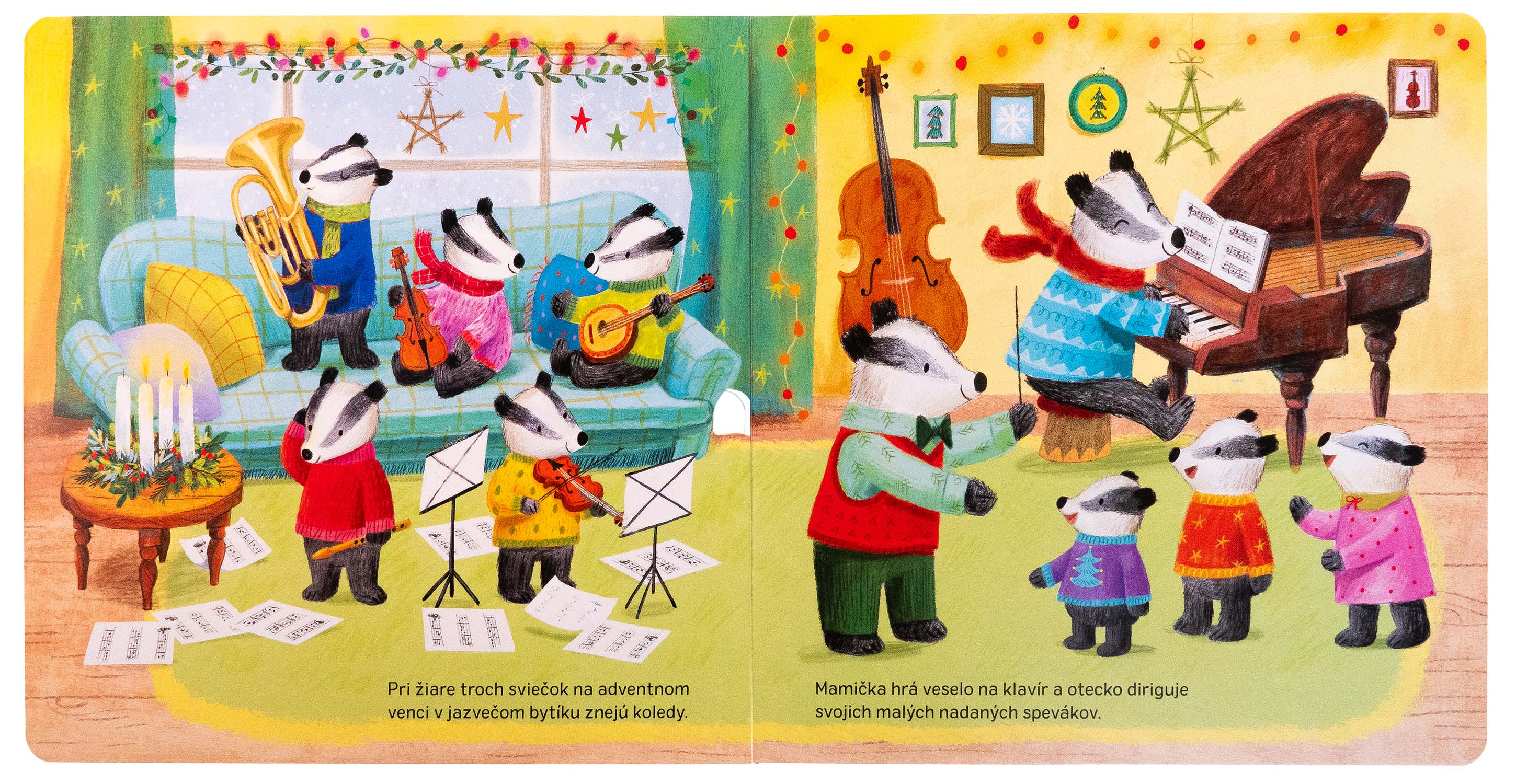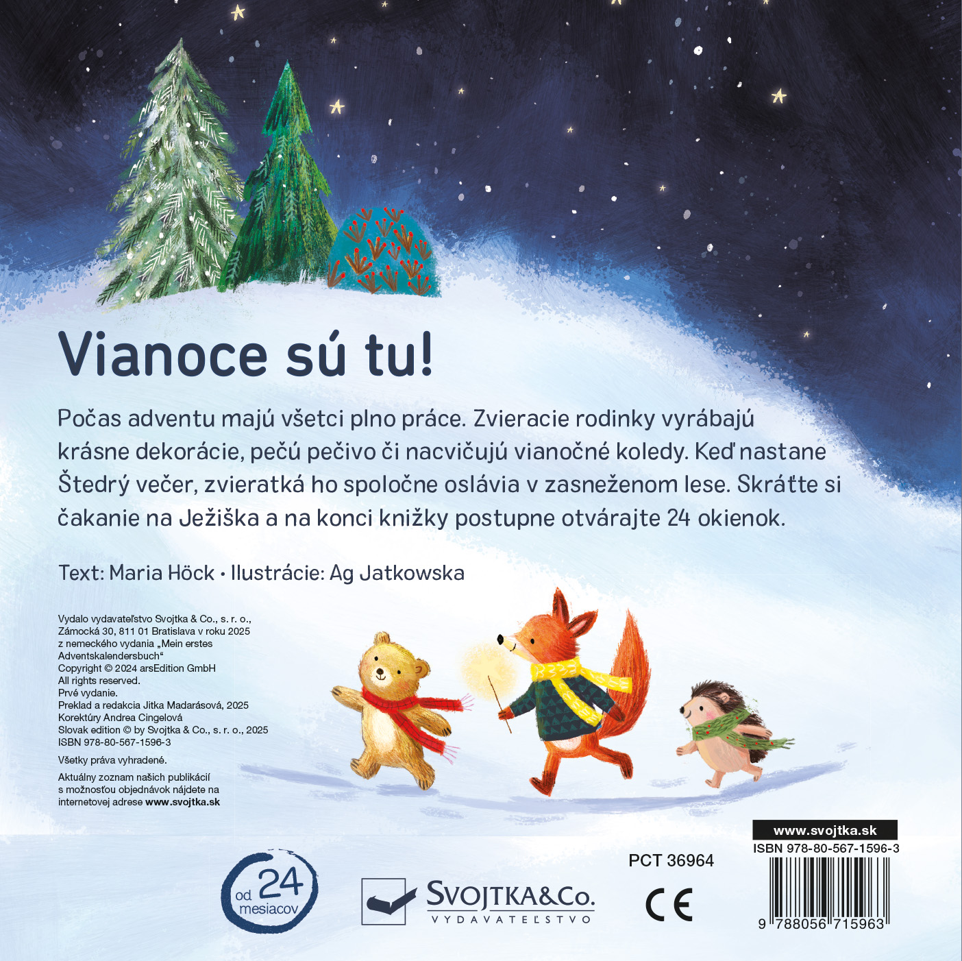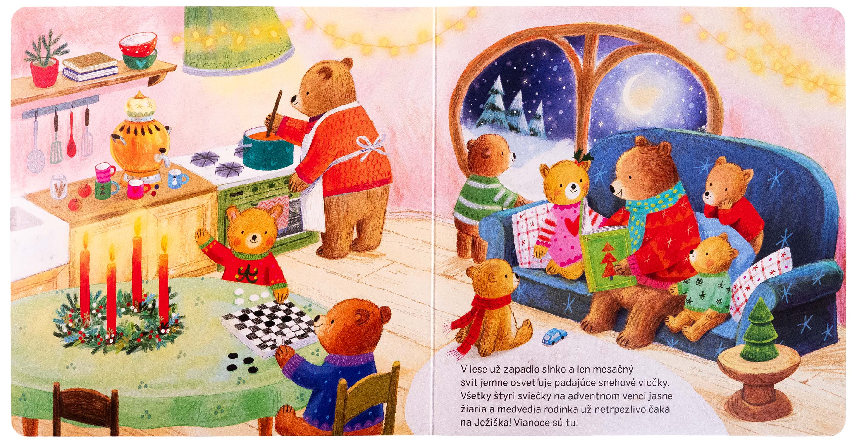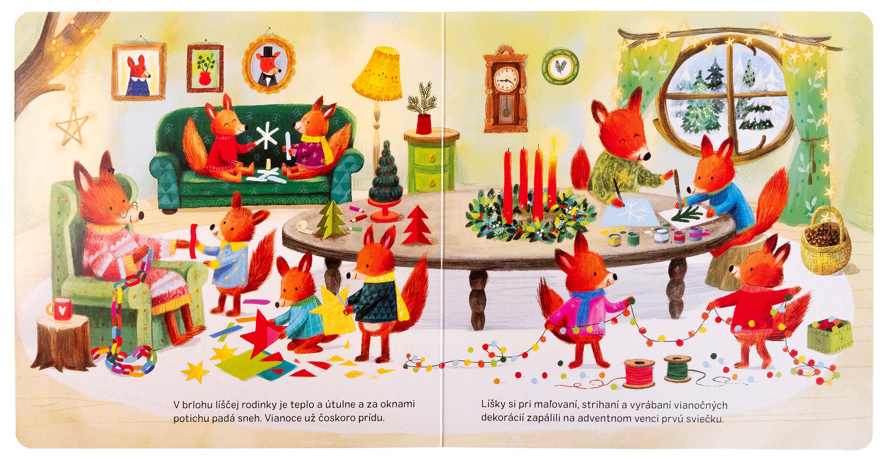 Behom adventu majú všetci plno práce. Zvieracie rodinky vyrábajú krásne dekorácie, pečú koláčiky alebo nacvičujú vianočné koledy. Až nastane Štedrý večer, zvieratká ho spoločne oslávia v zasneženom lese. Nahliadnite k zvieratkám do domčekov a nechajte sa zahriať kúzelnou sviatočnou atmosférou. Skráťte si čakanie na Ježiška a na konci tejto vianočnej knižky postupne otvárajte 24 adventných okienok.Počet strán: 12