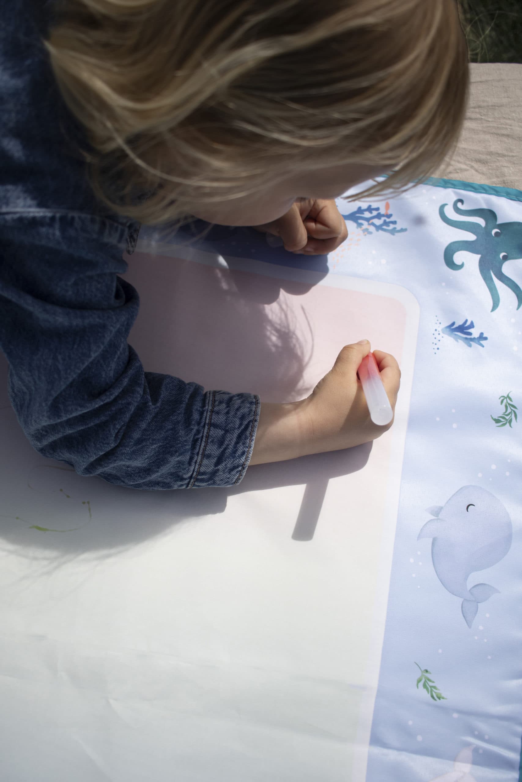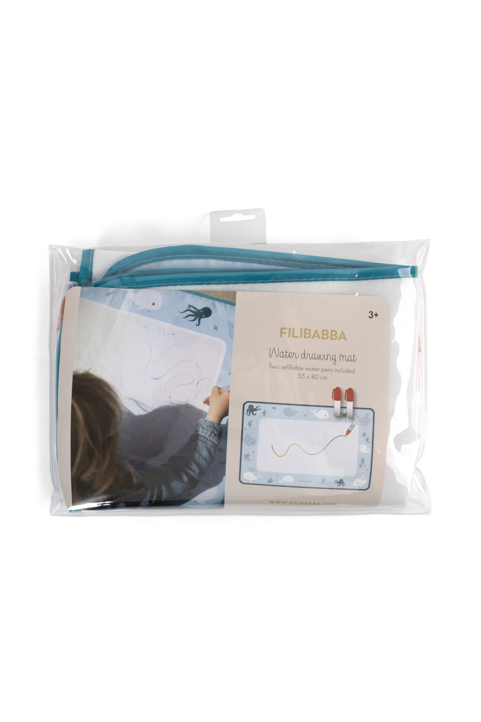 Tichý moment, jemný dotyk vody – a zrazu farby rozkvitnú ako mágiou. Táto snová vodná maliarska podložka umožňuje malým umelcom sledovať, ako ich fantázia ožíva v jemných dúhových odtieňoch – bez neporiadku a škvŕn. Nie sú potrebné farby ani fixky – stačí naplniť jedno z dvoch priložených pier vodou a sledovať, ako sa farby objavujú. Pokojný a hravý spôsob, ako objavovať kreativitu stále dookola. Podložka je dostatočne veľká na to, aby na nej mohli kresliť dve deti naraz. Keď kresba uschne, povrch je opäť pripravený na nové umelecké dobrodružstvá. Je ľahká a jednoducho skladateľná s praktickým popruhom – ideálna na doma aj na cesty, od obývačky až po slnečný piknik. Dizajn je inšpirovaný čarovným podmorským svetom – veľryba Christian pokojne pláva medzi svojou morskou rodinou, zatiaľ čo jemné prúdy sa vlnia na krémovom pozadí a vytvárajú pokojnú, snovú atmosféru. Základné vlastnosti: